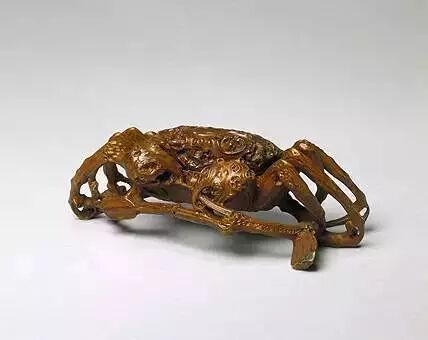 盒以天然木根略加裁剪雕刻制成螃蟹式。其背部粗糙,腹底光润,口眼清晰可辨,四足参差,螯举横挡,并保留半环形木枝,使蟹足置于其上,盒体安放稳定,设计十分巧妙。蟹背甲掀起即为盒盖,出人意料。盒内壁髹金漆,可用以盛装印泥。此盒貌似不事雕琢,实则匠心别具,是一件极为奇巧的文房玩物。
