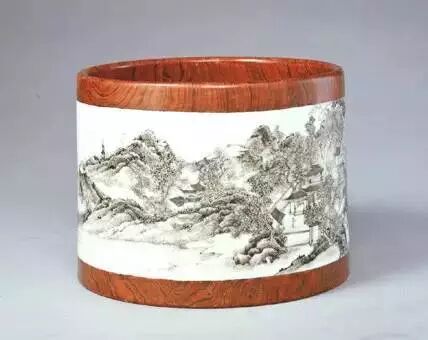 笔筒直口,璧形底。器内外壁上下边沿施木纹釉,外壁中部以墨彩绘山水图景,意境清逸。墨彩山水与木纹釉相得益彰,典雅怡人,是清雍正朝具有代表性风格的陶瓷文具。