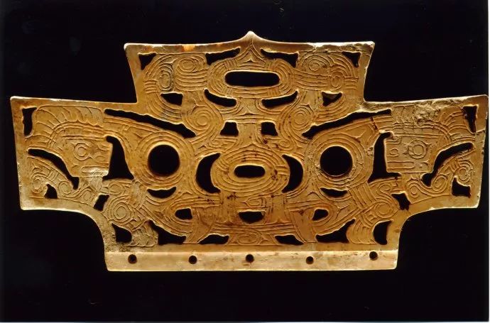 这类有凹缺的玉器在良渚文化中多见,大到一些环镯的端面,小到一些端饰,甚至管珠。早些有研究者认为另有它意,可能是一种契符或刻意雕琢的仪式,实际上误解了。瑶山M3:3三叉形器也如此,一叉正面上角有凹缺,纹样照样琢刻,如果有合适的大料,不会如此委曲求全。