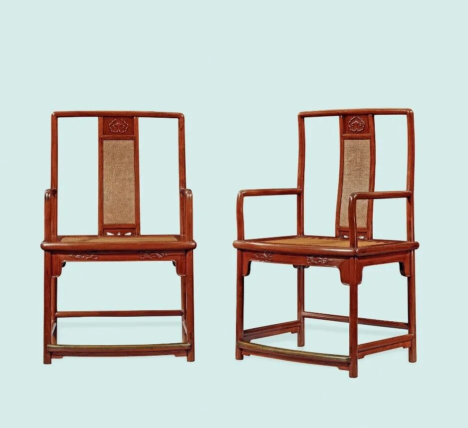 宋佚名《唐十八学士图》和宋张训礼的《围炉博古图》中出现的框架椅,以及出现在李公麟的《会友习琴图》中的框架椅,其形态接近于后来的玫瑰椅,只是扶手较高,可以被称为宋代的玫瑰椅,这可能是南官帽椅的发展雏形。在北宋李公麟的《维摩演教图》中的框架椅与明代的南官帽椅已经非常接近。在宋代玫瑰椅的基础上,元代设计师对这种框架椅做了更多的改进,从而创作了所谓的南官帽椅。因此我们可以说,南官帽椅起源于宋代,定型于元代,在宋代玫瑰椅的基础上结合了灯挂椅的结构特点发展而来。此对南官帽椅以黄花梨製,椅面为扇形,是其特色。通体圆材,却分隔出错落的方形留白空间,方圆呼应。搭脑平直,靠背板、后腿上截、扶手、鹅脖均三弯式。靠背板为三攒式,上部雕刻如意头,中部为菱格编纹硬屉,下部为壸门式券口牙子。座面格角攒边亦镶嵌菱格席面,边抹素混面,牙条上雕两只相向龙纹,沿边起线。腿足圆材,腿足间施步步高赶脚枨,前面及两侧赶脚枨下各有素刀口牙条,用来加固,正面赶脚枨上裹金属衬垫,起保护作用。整件作品看上去就是以圆形木棍区分出的方形空间,上部曲折婉转,下部方正有度,方圆曲直间,神态立现。Lot198