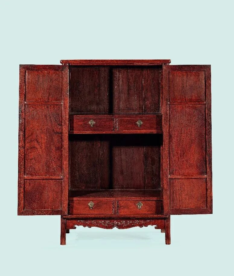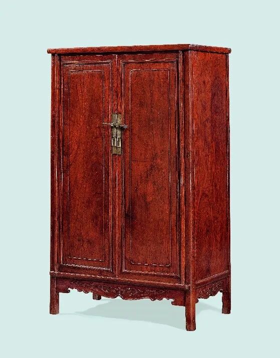 此柜黄花梨製,硬挤门式,无柜膛,帽檐微微喷出。其用材奢侈,即使柜顶板亦采用黄花梨木。纹理美观,柜门一木对剖,对称互动。侧板木纹同样漂亮,起伏若山峦。其特色在于门框铲地浮雕委角长方形阳线圈口作为装饰,去多存少,颇费工时,这并非落堂起鼓,然而增加了层次和变化。门上安长方形面叶,镂空吊牌。门内中部和底部均安抽屉两具,采用标准做法,抽屉脸用黄花梨,内里为铁力木。抽屉可以放置小件文玩雅趣,实用性强。柜腿外圆里方,三面均安铲地浮雕卷草纹的壼门牙板,与柜门凸起的阳线一起,构成此柜的主要装饰语言,实用之余又富有观赏性。Lot181