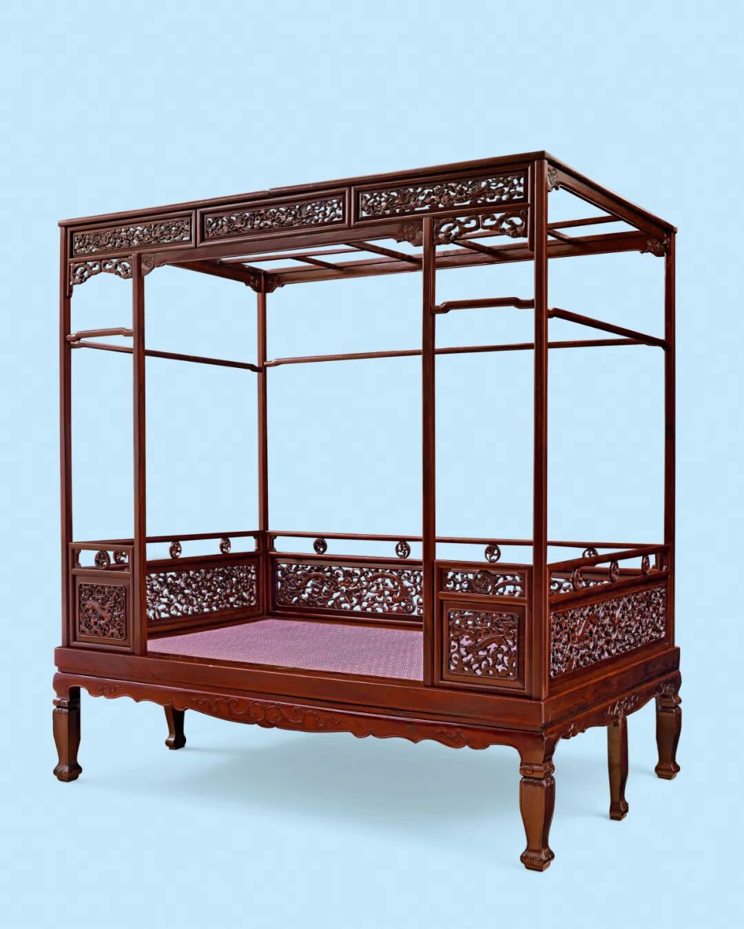 这张架子床是安思远为洪氏把关的最后一批家具中的一件,未来得及收录进《洪氏所藏木器百图》。它与我们常见的架子床有所不同,独特之处在于其六足设计,且足可拆卸,成为四足矮榻,这在存世和资料记载的架子床中是极少见的。此床早年出自浙江慈溪,为传世孤例。其特点如下:(一)床面可折叠,为活屉。软屉中间于底面做活榫,正面镶嵌铜片,恰好可以对折,设计巧妙。活屉的屉面下安四根长竖枨和四个短横枨,结构稳固。(三)此床可以是四足,亦可以为六足。既可以为榻,又可以是架子床。若不加高四足,可作矮榻使用,书房休憩、雅集或出行,十分便利;加高则是高榻,户外雅集最是熨帖。(四)两短边均可各加一条腿足,想法很有突破;因两侧腿足为较高的设计,加上之后,四足亦要求加高,此时便以榫卯加设四足,变身为六足高榻或架子床,堪称标新立异的创新之作。(五)挂檐、床围子、门板皆为整板透雕,反而不用攒斗,为的是结实牢固。从其可折叠、可加足的特点来看,此床在设计之初应是为了出行之用,整板雕花亦是考虑到途中不易损伤。而且纹饰为龙、凤、麒麟纹,可见其规格不凡。Lot199