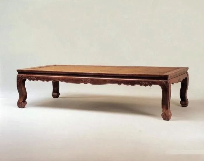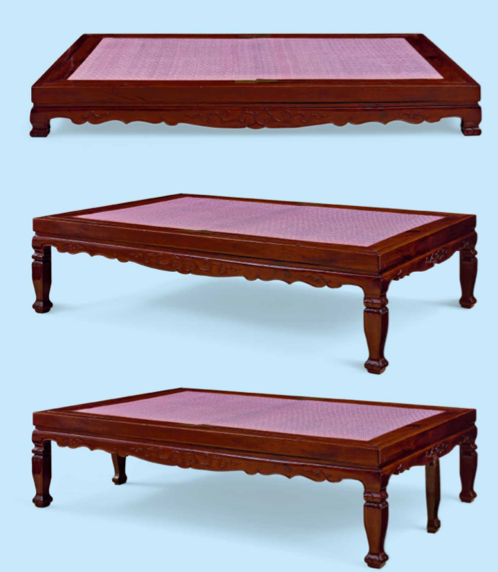 榻,用途多广,可坐可卧。有无束腰与有束腰之分,或直腿、或弯腿。三弯腿榻的相关例件非常少,只有某些曾经发表,包括一件曾入藏美国前加州中国古典家具博物馆的三弯腿榻,之後则见于纽约佳士得,1996年9月19日,拍品54号;另外还可参照一件黄花梨三弯腿罗汉床,刊载于古斯塔夫·艾克的《中国花梨家具图考》图版20;而明代《金瓶梅》版画插图中,亦载录一件相似案例。前加州中国古典家具博物馆的三弯腿榻