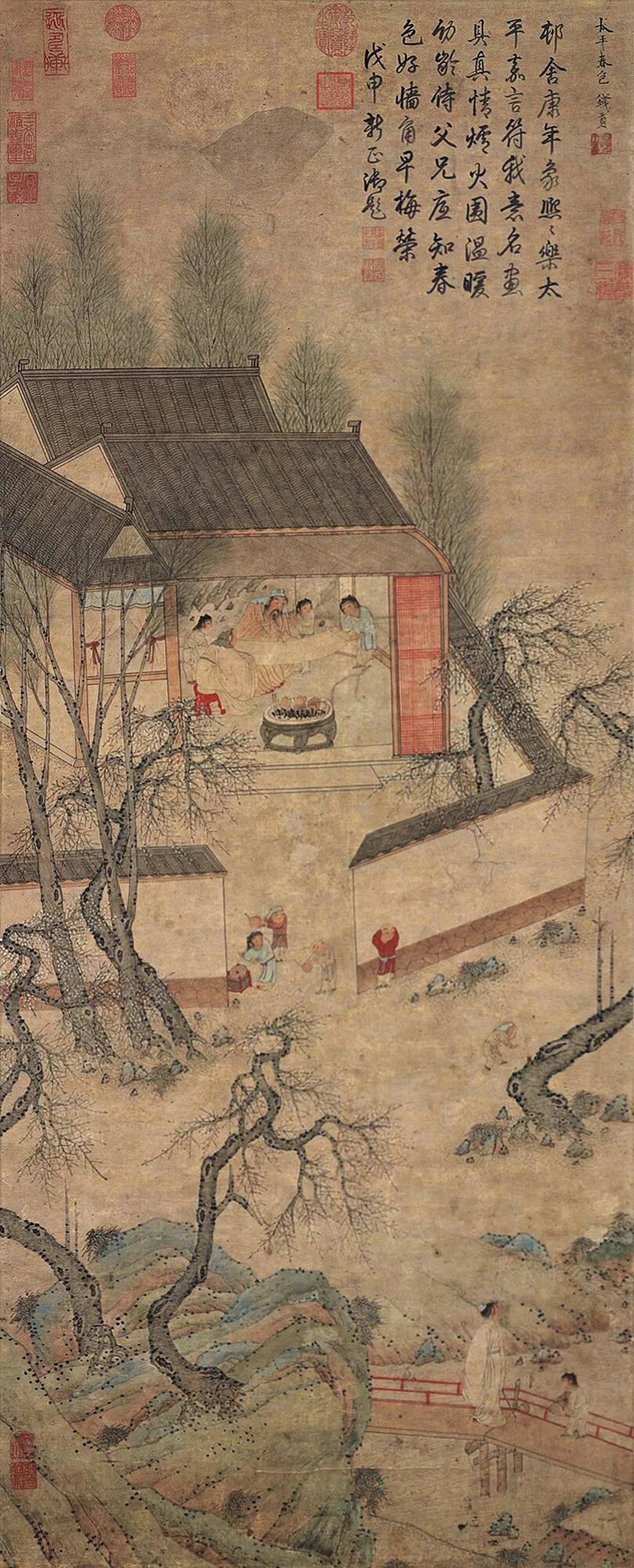 火盆架在明朝时期并不常见,发展至清代,火盆架才被普遍使用于古代大宅中。而用珍贵木材制作易损耗家具,着实奢华。此件黄花梨火盆架为六边形,配六根微带侧脚的圆腿。腿足上部每面均安枨子,内嵌回纹窗花图案,此图案来源于建筑,可在《紫禁城宫殿建筑装饰故宫内檐图案》中宫殿的落地罩上寻到踪迹,可以想象火盆架置于殿内,与落地罩和谐统一的美好场景。明 钱贡《太平春色图》
