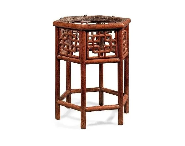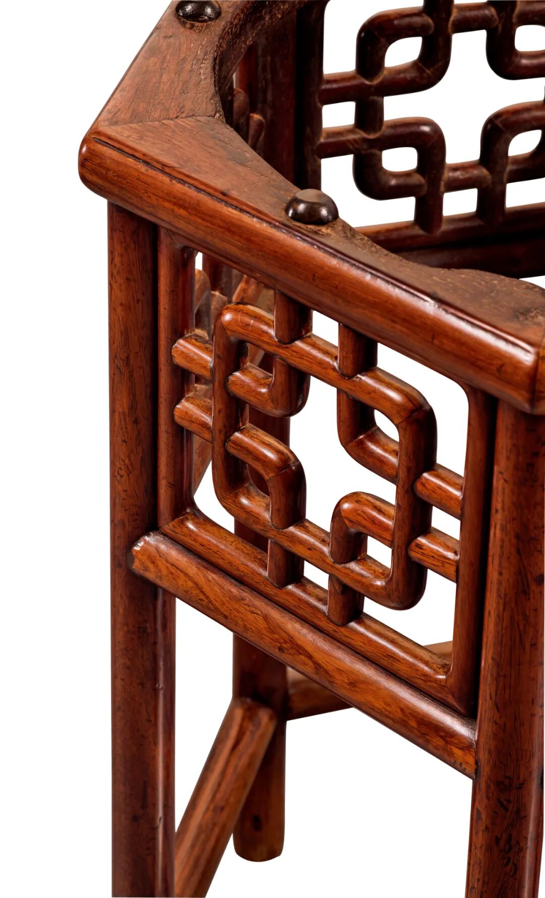 六边形内锼挖圆形置放铜盆,每边与圆形相切,互相映衬,给人一种寓规矩于方圆之感。每边中间安置一个鼓起的铜钉,是为防止木材烫伤,起到保护作用,其上可见使用痕迹。回纹装饰图案采用短小、圆润的木材,以斗簇工艺攒接而成,费工费料费时,从而推断其出身不凡。下端圆形管脚枨笔直光素,长方形空间内无任何装饰,起到加固的作用。Lot176