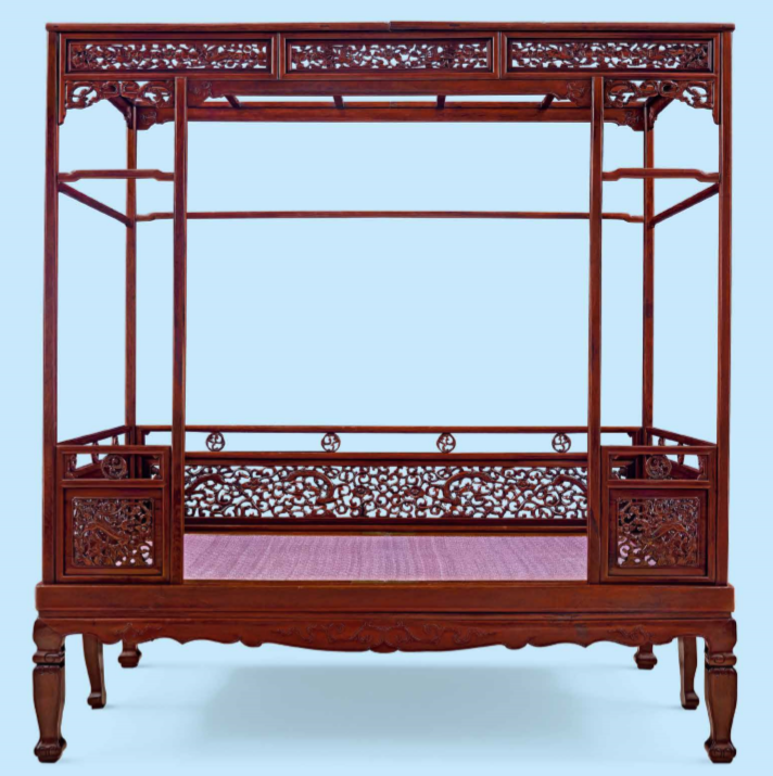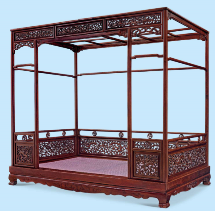 黄花梨可折叠式子母屉六足六柱瑞兽纹架子床