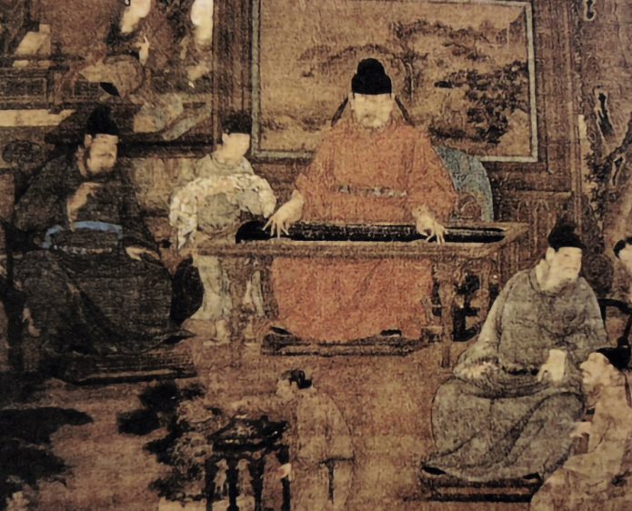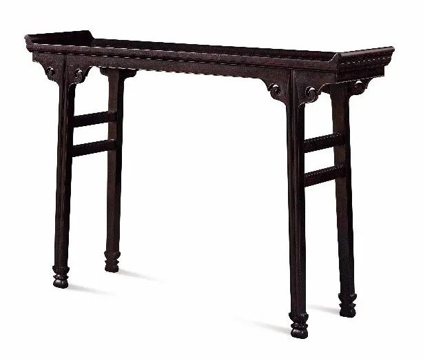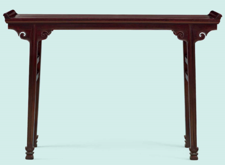 此案为剑腿翘头案,简洁的造型与优雅的曲线完美结合,是明式家具中罕见的造型。剑腿,来源于唐宋时期的壸门,在历史的发展中不断完善简化而成。五代周文矩《重屏会棋图》中便有剑腿的影子,江苏邗江蔡庄一座五代墓中出土的四张木榻,其腿足可算作剑腿的早期形式。剑腿造型的案类家具,多见于其他木质,紫檀罕见,故宫博物院收藏明式家具中,剑腿造型的家具多见于漆质条案,目前仅见一件紫檀剑式腿条案,据档案登记,原为景阳宫之物。洛阳苗北村五代墓壁画,墓室内采用砖雕和彩绘壁画相结合的方式,砖砌桌椅等家具,彩绘人物