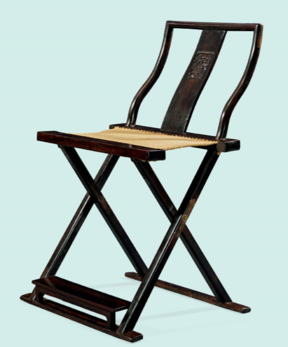此交椅紫檀製,直后背式,搭脑平直,椅面以上,后腿、靠背板均三弯式,靠背板上方开光浮雕五蝠纹立体纯熟。椅面及以下尽为方材,椅腿间以铜合页相联,多处交接部位均有铜片加固,且铜件皆为原装。光素脚踏下安素券口牙子,牙头涡卷形。在椅子类家具中,椅面上部圆材、下部方材的情况比较多见,这或许与中国人固有的“天圆地方”观念有关,同时方圆、曲直相映成趣。Lot179