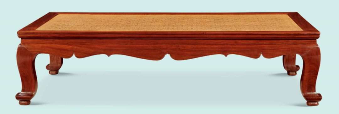 此榻以黄花梨为材,用料大度,榻面软席,坐卧舒适。边抹渐次凹进,束腰与牙板一木连作,文脉相连,流畅美观。也从侧面反映了此床用料的奢侈程度。底部有两根弯带,四角有斜短枨加固,结构考究。牙、脚圆格角相交,沿边起细致的灯草线。三弯腿弯弧曲线优美,足底踩珠。牙板与腿足的轮廓线舒展大方,一气呵成。四面做工,可陈设于厅室中间,面面观看。