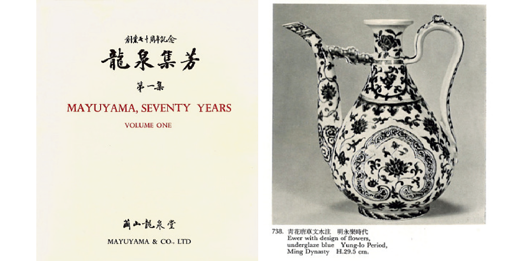 而本件拍品亦出自龙泉堂旧藏。茧山龙泉堂由茧山松太郎(1882-1935) 于1905 年创立,为日本知名古董店,与山中商会齐名,日本多件顶级的博物馆藏品由茧山龙泉堂经手。1976 年,茧山龙泉堂于70 周年之际,特别编写一套两卷的著作——《龙泉集芳》收录其历年珍品,其中便包括了本拍品。本品一改元青花粗犷豪放之风,器型典雅,纹饰细腻,来源有序,当为永乐青花执壶之翘楚,可堪宝藏。出版图:《龙泉集芳》