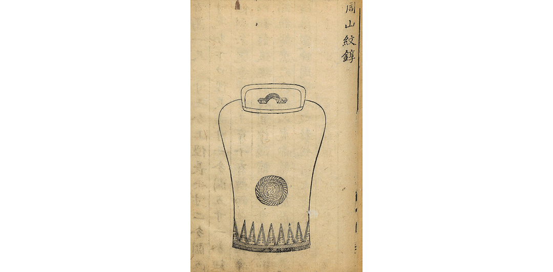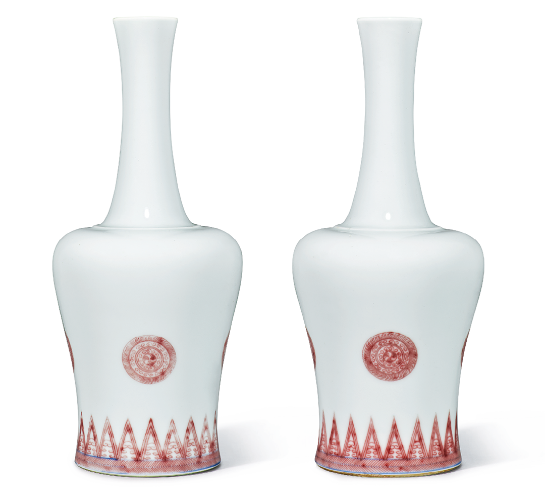 HKD 10,000,000-15,000,000清康熙·青花釉里红团花纹摇铃尊为清康熙一朝独有,此器腹部造型及纹饰取材商周青铜器 ,《宣和博古图》中刊录的「周山纹錞」,与之极为相似,应为其蓝本原型。撷取「錞」之式样作为腹部,釉里红描绘的漩涡状团花纹及胫部绘饰一周青花釉里红锯齿状纹样亦与「周山纹錞」上的纹饰如出一辙。其上设长颈,令整体造型形似摇铃,与蒙藏地区的白塔颇为相似,反映出皇帝对于藏传佛教之虔诚信仰。周山纹錞,《宣和博古图》卷二十六,页14