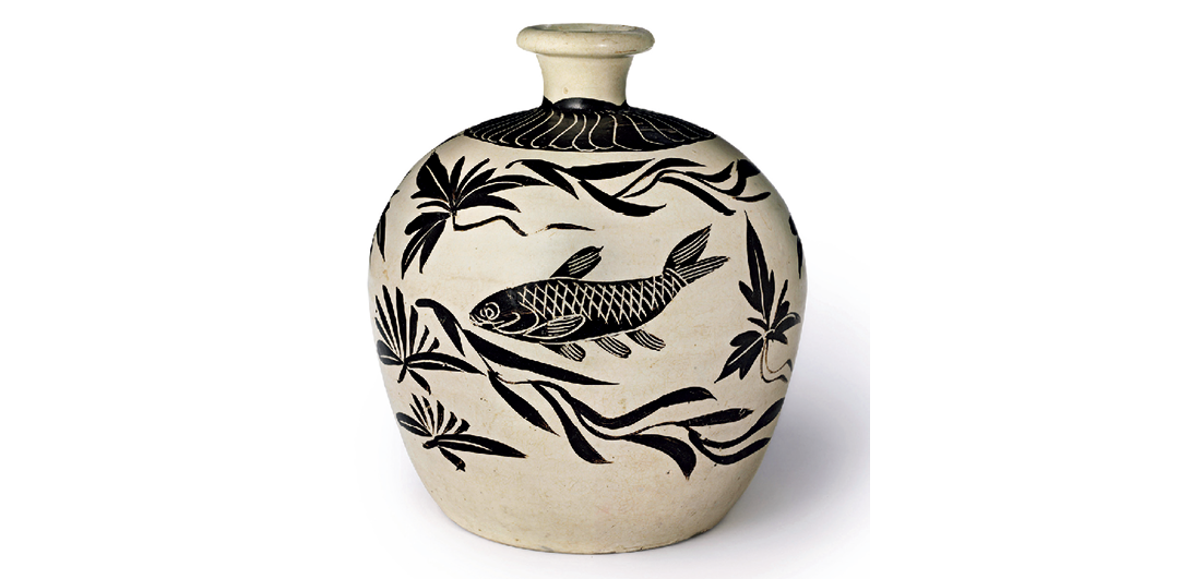 对比图:纽约佳士得,2018年春拍《古韵天成-临宇山人珍藏》专拍,编号513:北宋/ 金 磁州窑白地黑花鱼藻纹小口瓶,成交价1358.5万港币