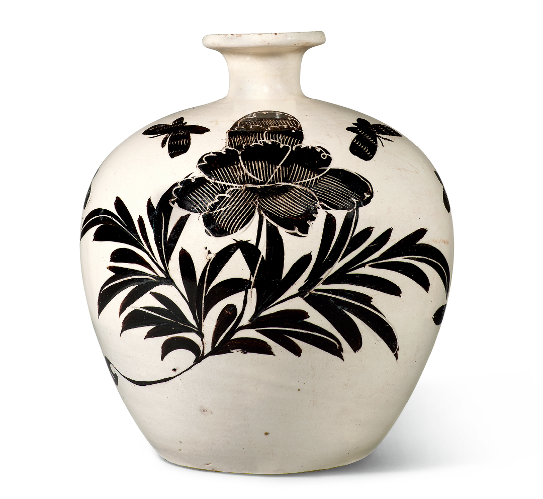 磁州窑白地黑彩剔刻蝶恋花纹小口瓶