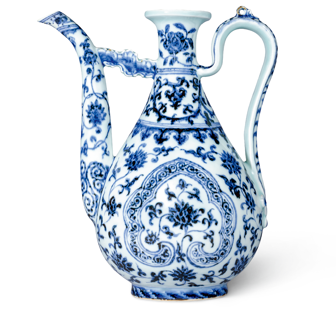 明永乐·青花如意开光缠枝莲纹执壶为永乐御瓷经典的玉壶春式,腹部纹样与常见之通体绘缠枝花卉或开光折枝花果纹的执壶(参考香港天民楼藏明永乐青花缠枝牡丹花纹执壶及故宫博物院清宫旧藏明永乐青花折枝花果纹执壶)相比,较为特殊,甚为少见。检视海内外馆藏作品中,与之相同者目前仅知四例。一件为土耳其托普卡匹宫殿博物馆收藏,两件藏于伊朗阿尔德比清真寺,另一件收藏在西藏博物馆。于市场流通中的相同者寥寥无几,可查资料中仅知二例。其中一例曾于香港佳士得2003 年秋拍现身,后售于北京拍卖会2010年6月7日,编号2973,成交价为1120万人民币。另一例源自日本茧山龙泉堂,于2010年4 月8 日香港苏富比拍卖,编号1850,缔造了港币18,580,000之佳绩。(左)土耳其托普卡匹宫殿博物馆藏:明永乐 青花唐草花卉水注