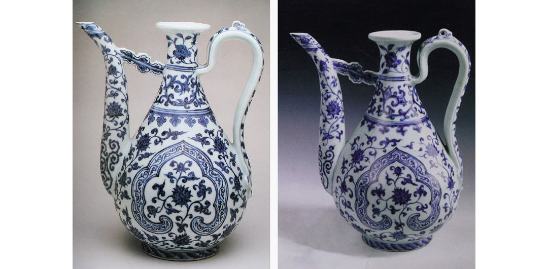 (右)西藏博物馆藏:明永乐 景德镇窑青花开光莲纹执壶