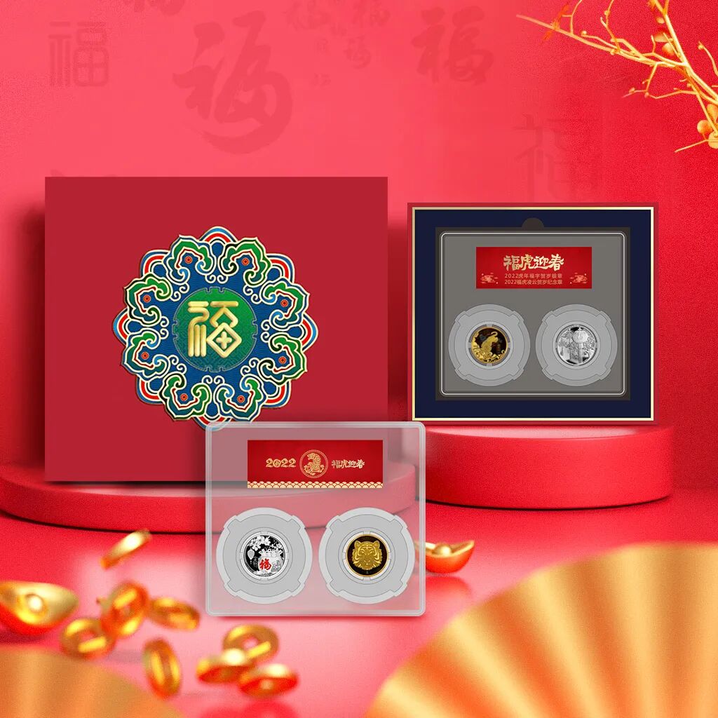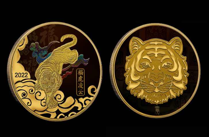 铜镀金幻彩虎章,应用超时尚的幻彩工艺,独立封装设计,传统的如意云头纹图案包装礼盒,喜庆、精致又大气。