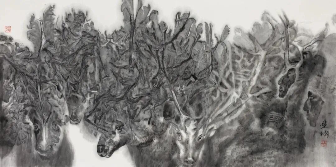 纪连彬在中国画领域的探索成就是通过中国画语言的开拓创新进行的。以意象、幻象及幻化的语言方式,以写实的具体表现手法表现了精神空间对现实的写意超越。