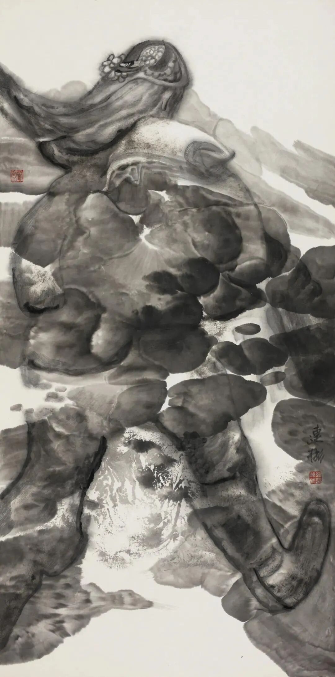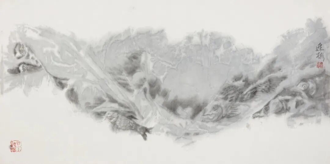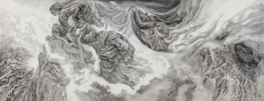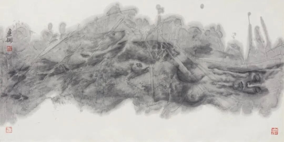 运用笔墨的表现,通过圆润的线与墨气的交织纵横,形成云形、云气掩映下的神秘莫测的梦的境地。在水墨画用墨单纯表现的同时大胆用色,这在他作品中又体现出另一特征,即浓墨重彩与水墨单色黑白渲染有节奏地突出互换,减弱一种状态给人造成疲劳的可能性,加强其视觉对人深层思维的冲击。