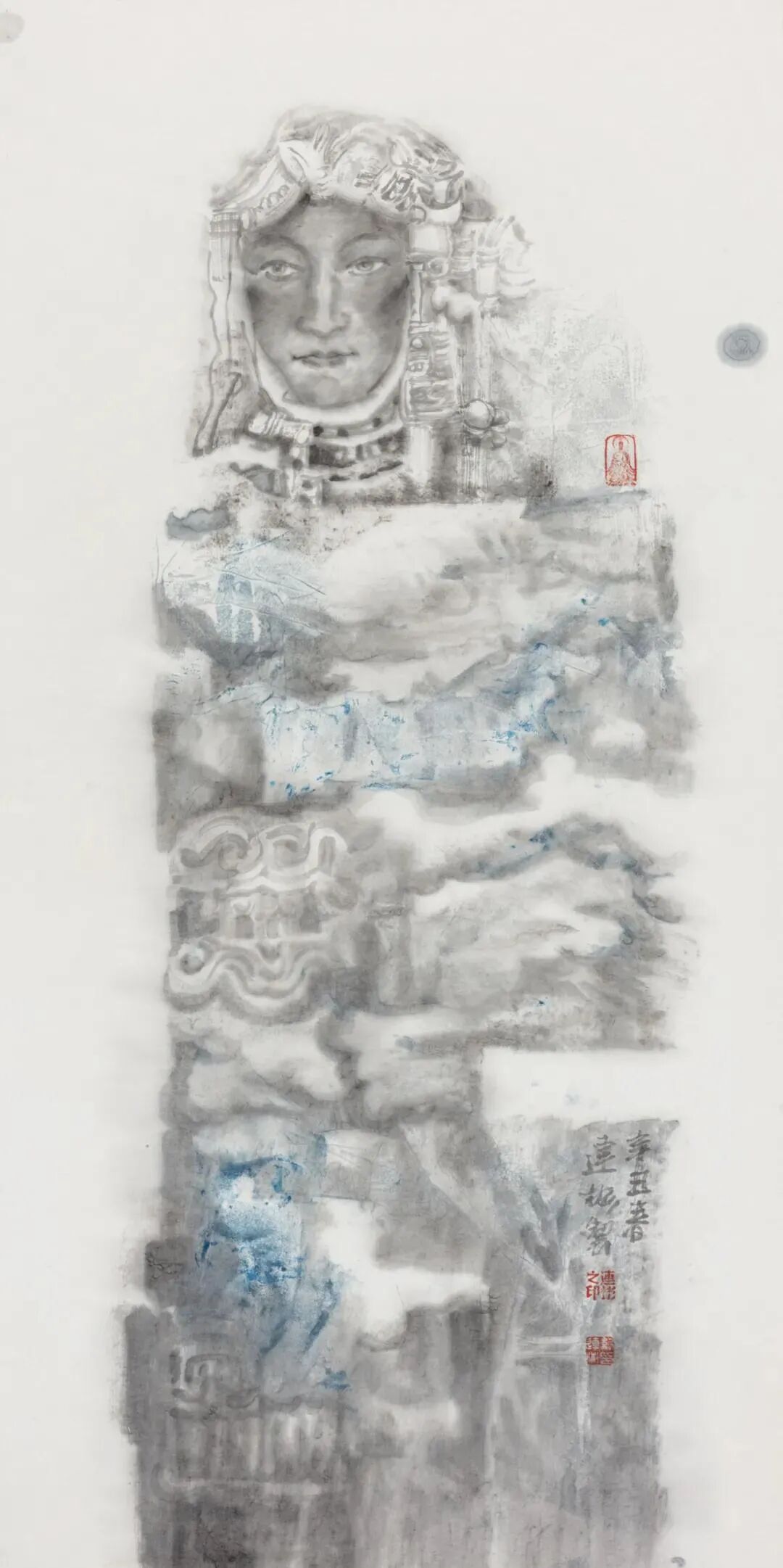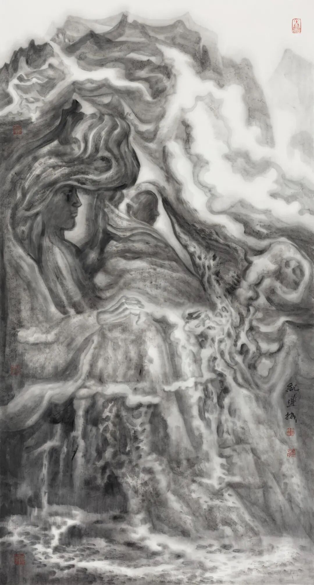 在天地人神的大空间里,传达出“天人合一”、“物我相融”的中国文化精神。他以独特的视觉造型,笔墨新语和丰富的艺术想象力形成了自己的精神指向。在水墨和色彩两类效果上的大胆突破,丰富了中国画的色彩语言,是对人物画表现领域的拓展。