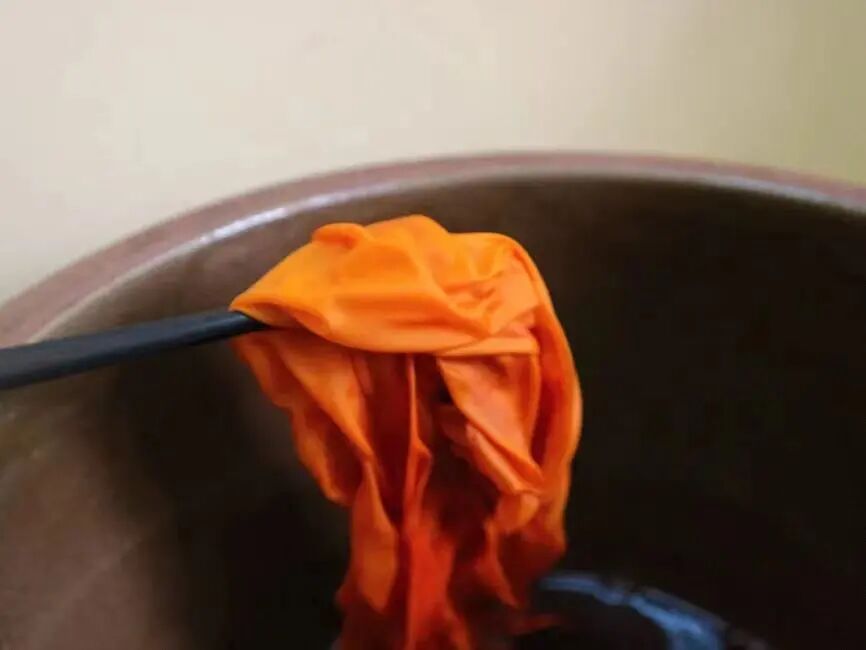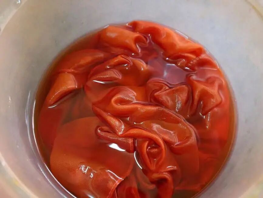 将刚才精练过的布料拧干,放入染缸浸泡。中途要不断轻柔翻搅,使之均匀上色。随着浸泡时间的增加,颜色也会加深,需要密切留意。