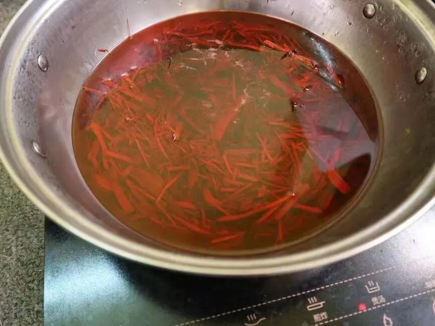 媒染剂能加速染液跟布料的结合,常用明矾,用温水溶解备用。将苏木放入清水中熬煮,过滤后留下染液,放凉至60℃左右备用。