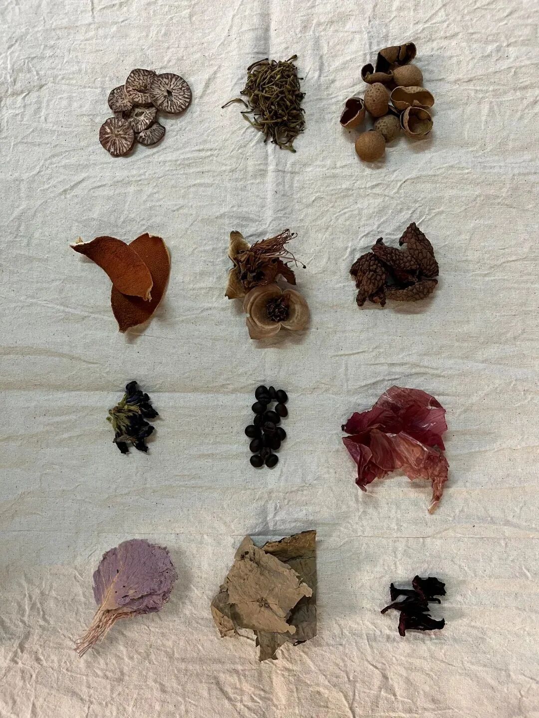 ▲“红楼梦色彩重现”系列丝巾与植物染色工具