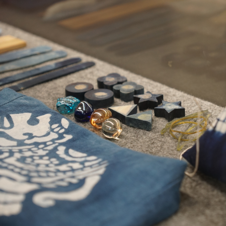 除了基础的染色,使用铅笔、橡皮筋、棉线、夹子、手套以及木棒子等工具,用传统的方法染出自己设计的图案。