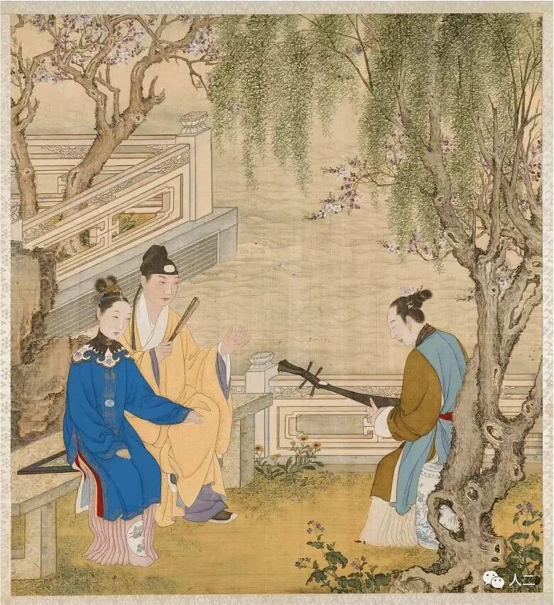 图的左下角有个童子在敲鼓,鼓架子髹朱漆,柱头雕龙纹。这架子如果留到现在准得被卖家具的忽悠成文房用品,一准儿说这朱红架子是卷缸架,如果您不了解,还保不齐就信了卖家具的话,多掏个大几万。画面里又出现了斑竹,这次是斑竹围栏,古画里用斑竹做围栏的情景挺多,各朝各代都有,见过很多次。古代上流社会还是非常喜欢斑竹的。装饰效果确实也很好,雅气。