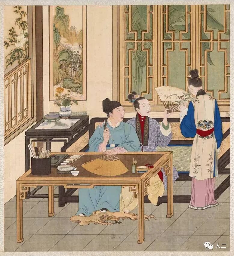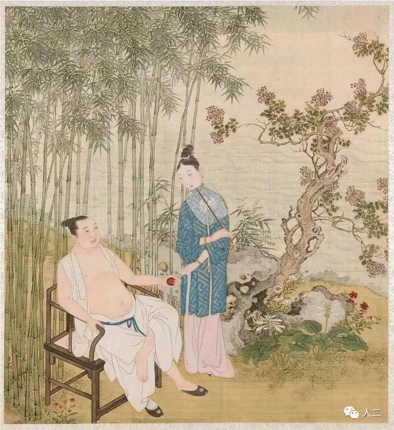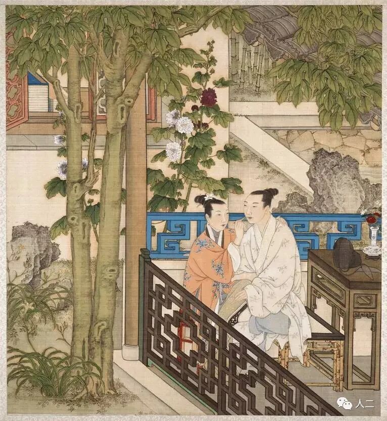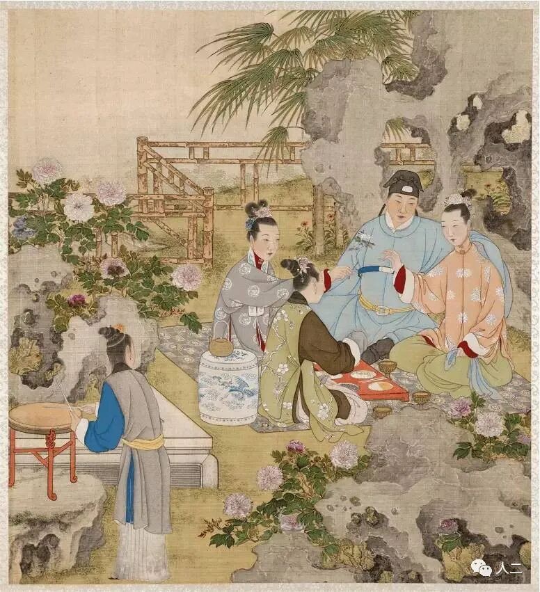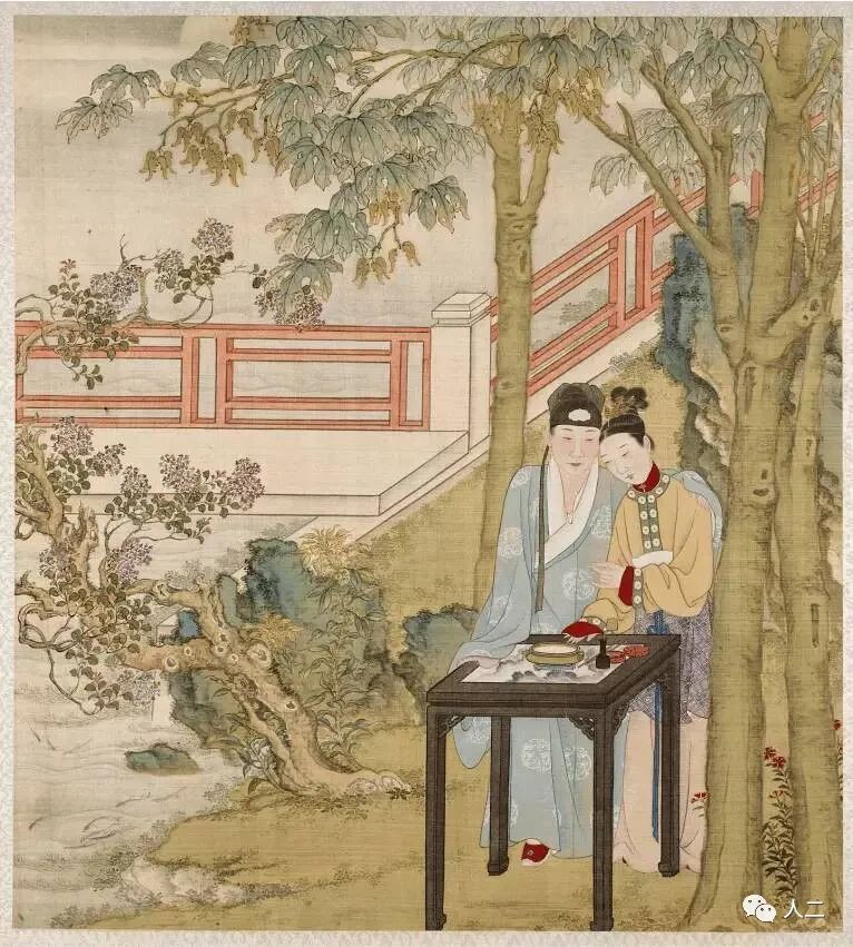 我们推崇的焚香都在室内,没想到这二人直接把炉瓶三事搬到了花前树下,这样的情况之下,就必须是风和丽日的日子,不然用香粉打出来的香篆就要吹散架了。这个场景焚烧一颗自己调制的香丸香饼倒是不错的选择。或许,他们二人也正在商量用什么香才更合适呢。