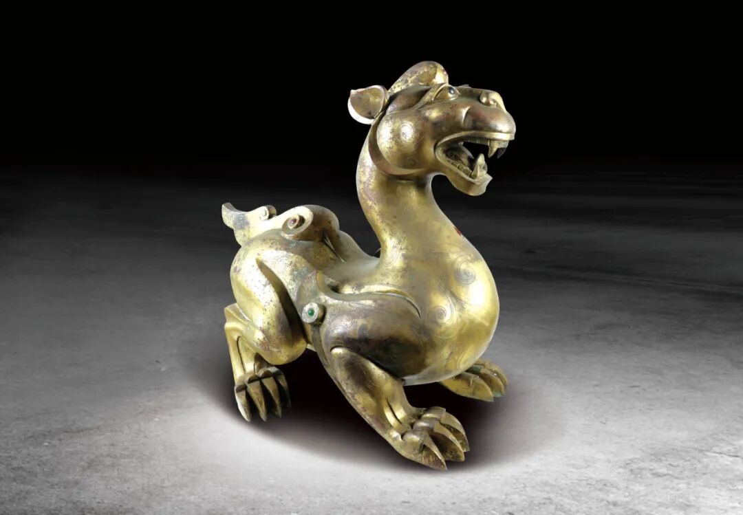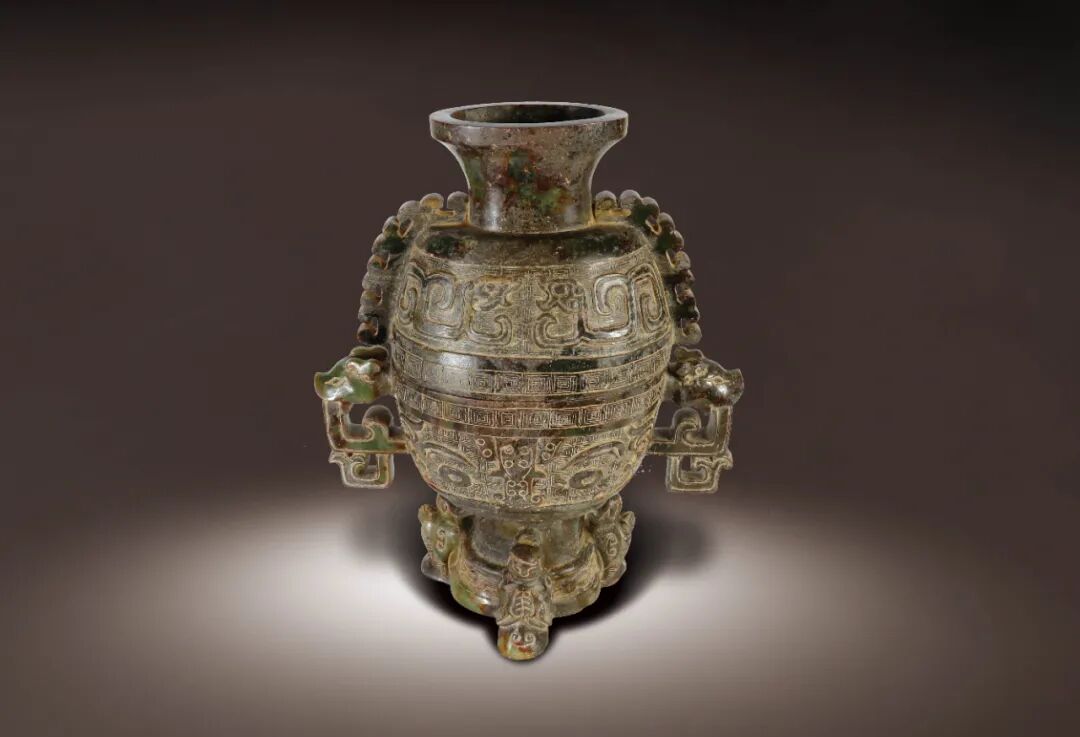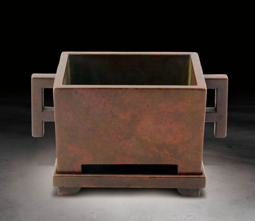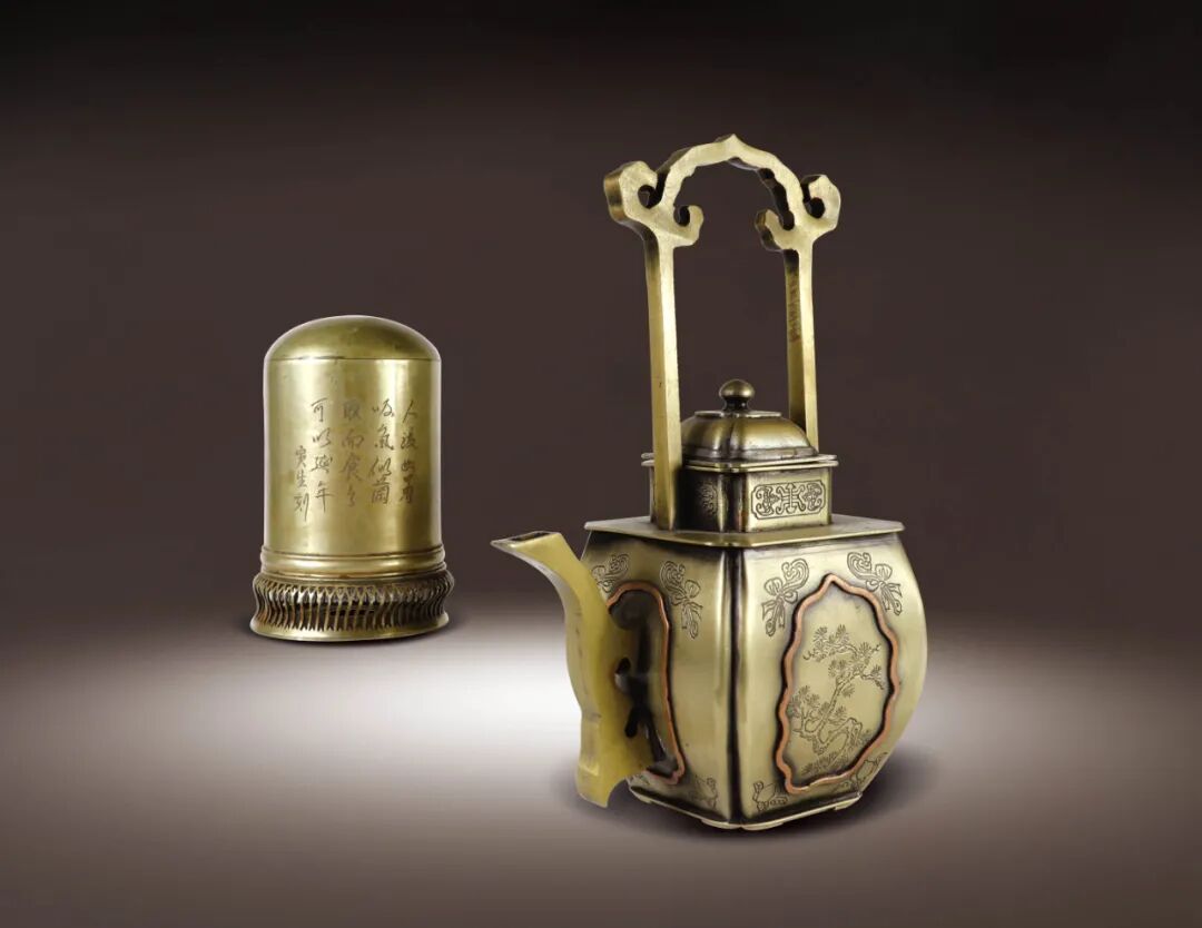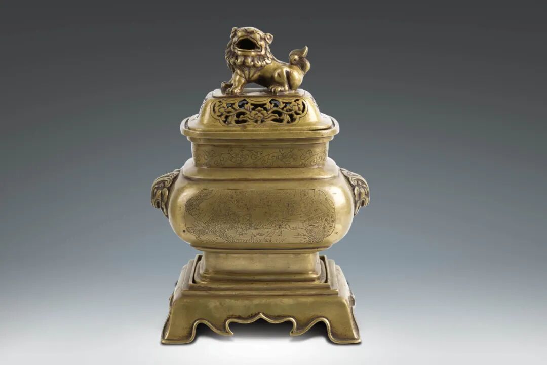 650 清 銅雕山水人物紋獅鈕鋪首耳香爐