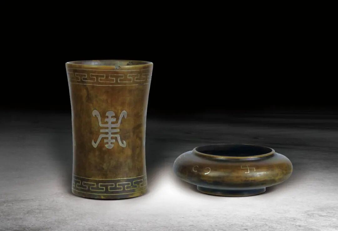 653 清 銅銼銀泉字款水洗、壽字杯二件一組