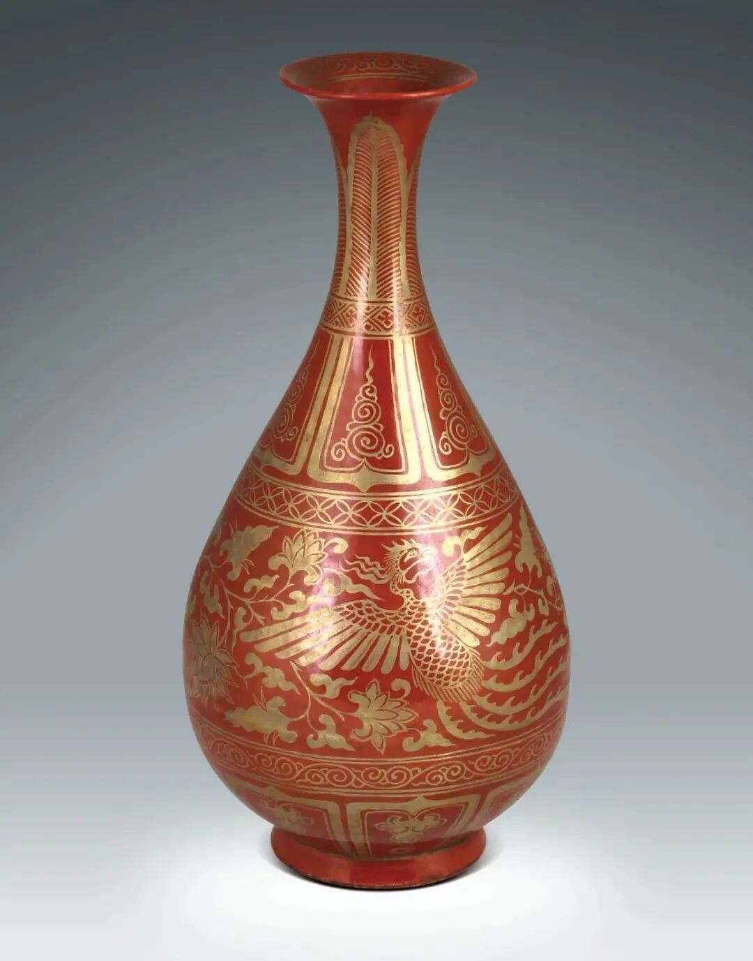 495 明 紅釉描金瑞獸紋玉壺春瓶