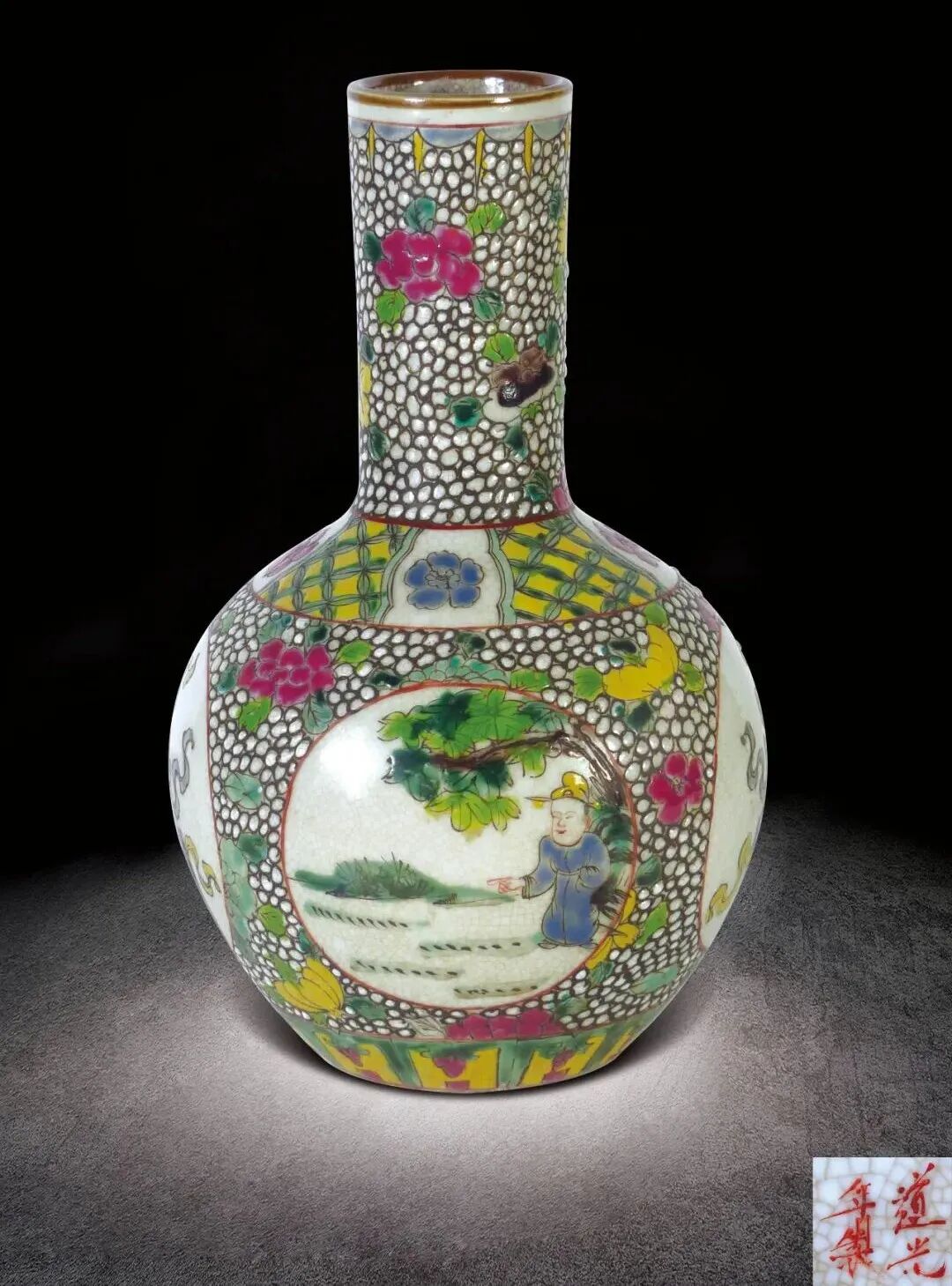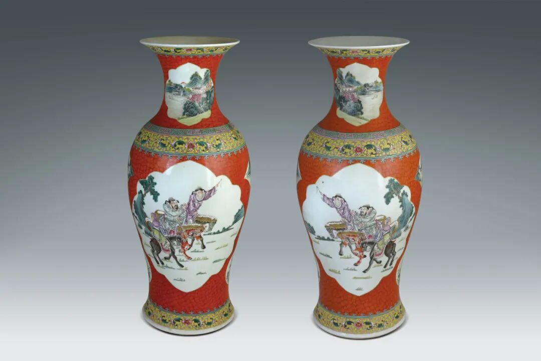 483 清末 粉彩珊瑚紅釉開光人物紋山水瓶一對
