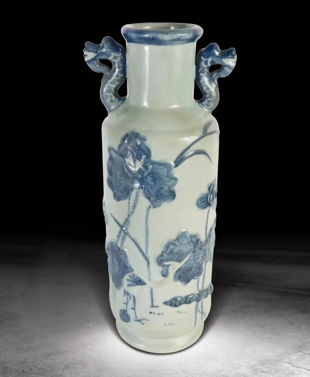 471 清 青花雕瓷荷葉龍首雙耳瓶