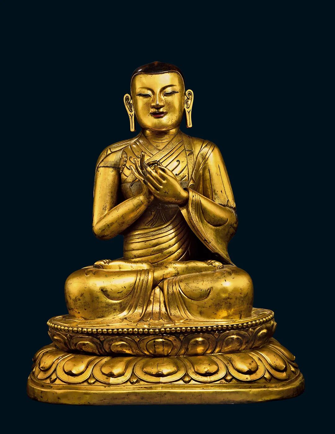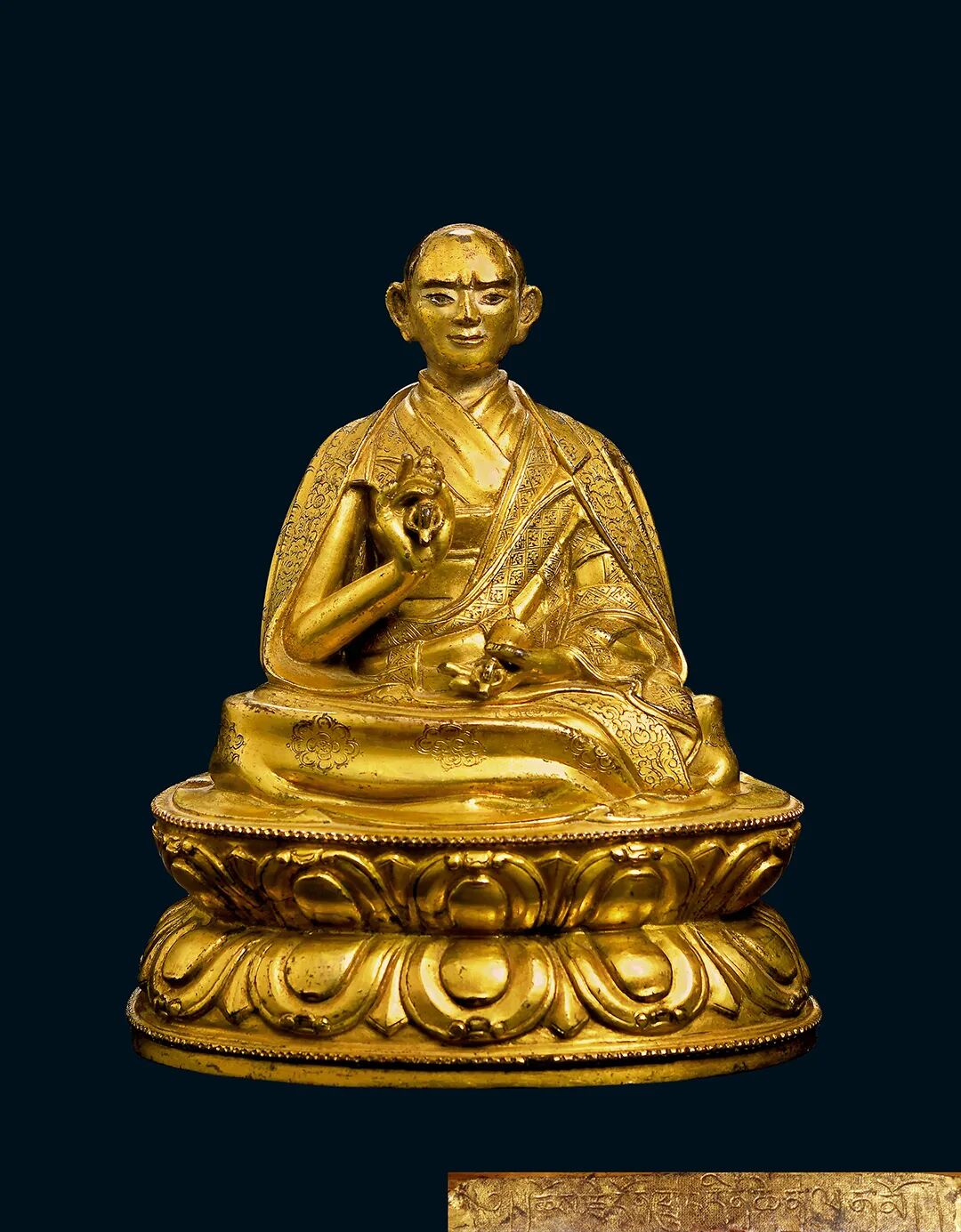 此尊造像,以精湛的铸工塑造出大师年迈的形象。法王身着藏式僧衣,端坐于仰覆式莲台上。面容威严,目光如炬。手持金刚铃杵,姿态富于动感,意图表现大师行密宗法事时的形象。衣纹处理写实自然,突出了织物的柔软质感,同时辅以精致的錾花更突显其尊贵身份。整像保存完整,镀金光亮,是一尊难得的西藏16-17世纪的造像,值得收藏。通过造像底座背面镌刻的藏文题记,可将此尊喇嘛像的身份确定为法王曲杰·顿珠仁钦。曲杰·顿珠仁钦(1309-1385),生于青海黄南,在青年时代入噶当派研习大乘佛法。在游学历程中,顿珠仁钦足迹遍布卫藏各大噶当派寺庙,其中包括噶当派的主要法场:聂塘寺、纳塘寺等。回到家乡后,其在今青海化隆县组织修建夏琼寺,使该寺成为安多地区最为著名的一座噶当派寺院。顿珠仁钦与夏琼寺更为后世所熟知的原因,是由于格鲁派创派宗师宗喀巴即是在此学经,其人生第一位佛法导师便是顿珠仁钦。根据格鲁教内关于宗喀巴大师生平的记载,其自幼依止顿珠仁钦,并在7岁时,由顿珠仁钦为其授沙弥戒,乃为成就一代大德之缘起。因此,即便在格鲁派兴起后,顿珠仁钦依旧被视作该派的重要祖师予以顶礼膜拜,其灵塔始终安置于夏琼寺内,包括三世、七世达赖喇嘛在内的众多格鲁派高僧都曾为灵塔献上珍贵的供养。1817