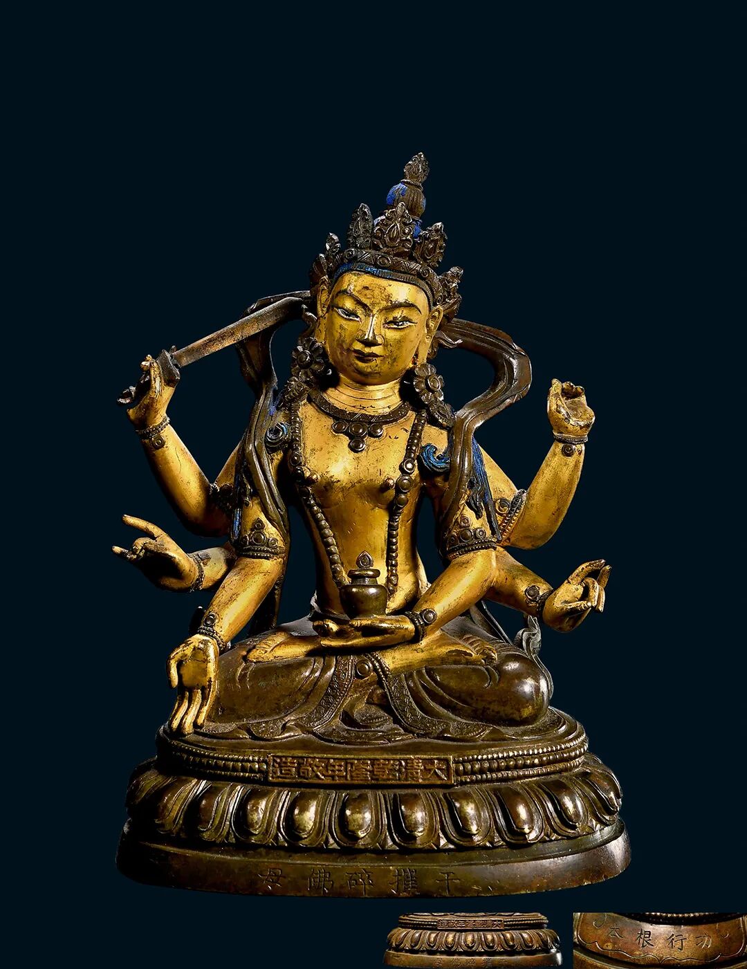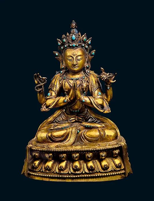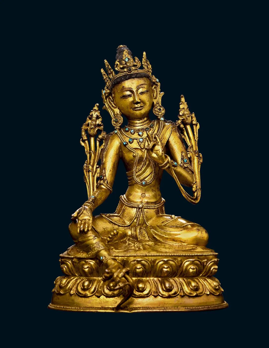 近年来,康熙时期的佛造像在艺术市场中一直占有重要地位,其整体工艺水准较永宣宫廷造像毫无逊色之处,因而被视为明永宣宫廷造像之后的艺术巅峰之作。康熙时期造像凝聚了明代汉藏两地造像艺术精髓,遵循写实艺术风范,铜质细腻,铸造工艺精湛,雕刻娴熟。其特点主要是造型端庄大气,神韵庄严华美,金色璀璨夺目,皇家气韵十足。北京地区官造的佛造像面相丰圆适中,五官塑造写实,神态静谧祥和,充分展现出汉人的面相特征。康熙造像相比乾隆更为精美和稀少,所以康熙造像也一直在拍场上屡创佳绩。此像头戴宝冠,头顶束高发髻,余发垂肩,耳际缯带飞扬,耳下垂圆环。面相方圆,双目低垂,表情慈悲柔和,以菩萨慧眼凝视众生。观音结全跏趺端坐,主臂双手于胸前合十,右上手持有念珠,左上手持荷花。上身双肩披帔帛,帔帛于两手腕间分别绕成半圆环,而后从两腿下对称垂搭于莲花座两侧;上身袒露,胸前饰项圈、璎珞,手足戴钏镯,种种庄严,雕刻精细,并镶嵌松石。下身着长裙,腰间束带,长裙轻薄贴体。腰间束带,腰带下缀有联珠装饰;帔帛及僧裙皆用写实手法表现,生动自然,尤其是垂于座前的帔帛写实性极强,给人以丝织物的柔软质感。莲花座造型大气,上下线饰两圈连珠纹饰,莲瓣一周,饱满圆润。莲花座造型优美大方,做工极其讲究,其整体呈半月形,宽大厚实,仰覆莲花瓣上下对称分布,环绕莲座一周,上下边沿各饰一周联珠纹;莲瓣宽肥饱满,其边缘及头部皆饰有精美的卷草纹饰。其整体风格与北京故宫博物院珍藏的一尊康熙二十五年(1686年)铜镀金四臂观音像极其相似,不仅造型宽大、气势恢宏,而且手法写实、工艺精湛,展现出清康熙宫廷造像鲜明特点。四臂观音是雪域西藏的守护神,藏人由老至幼家家户户,皆吟诵其六字大明咒:“嗡嘛呢叭咪吽”。四臂观音舆文殊菩萨、金刚手菩萨,合称三族姓尊,代表大悲、大智、大力,为密乘行者人人必修的法门。四臂观音的造型每一庄严皆有所表,一头表通达法性,四臂表四无量心,身色表清洁无垢,不为烦恼、所知二障所障,双跏趺表不住生死,手印表不住涅槃。又中央二手合十表智慧与方便合一双运,另右手念珠,表每拨一珠即救度一众生出脱轮回,左手表清静无恼。1863