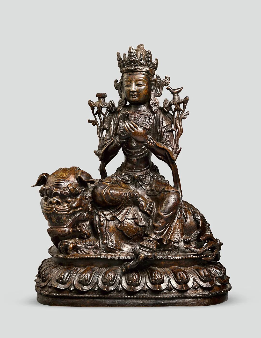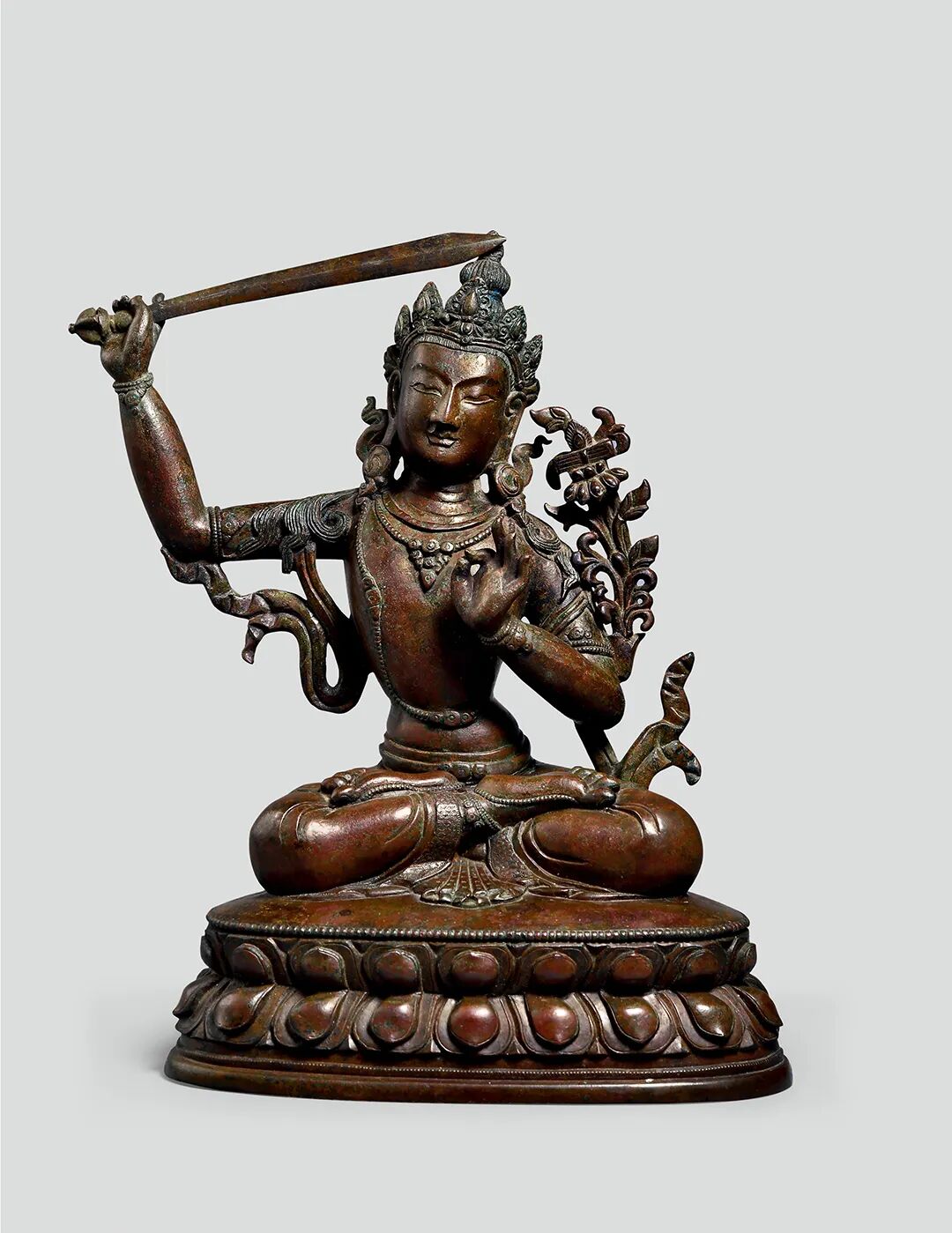 文殊菩萨为八大菩萨之一,象征般若智慧,清代帝王被视为文殊菩萨之转世化身,故文殊造像为宫廷造像之代表性题材。从康熙时期起在北京紫禁城内的造办处监制了许多金铜佛像,加之乾隆皇帝本人笃信藏传佛教,亲自过问佛像的样式,故而在十八世纪时期所制作的造像通常制作精美、细腻,体现了宫廷的审美趣味。此尊文殊菩萨头戴五叶花冠,顶结高髪髻,大耳垂肩,耳后有宝缯,面容圆润饱满,双眉细长,双目有神,鼻梁平直笔挺,唇线清晰,法相森严。整像为乾隆宫廷造像,造像比例结构精准,宽肩窄腰,躯体柔软,肌肉饱满有力,身体微向右倾,体态婀娜,富有动感之美。上身袒露,仅披帔帛,以项圈及长链为装饰,手和足部有钏躅装饰。右手高擎宝剑,横断上空,能斩断一切烦恼与愚痴;右手当胸前结说法印,左臂缠绕莲花于肩头齐平绽放,莲花托般若波罗蜜多梵匣,代表般若智慧浩瀚如经卷。下身着长裙,衣褶散落于座面,腰间束宝带,衣纹流畅优美。结跏端坐于双层束腰式莲花宝座上,上边缘饰一周圆形连珠纹,束腰深陷,莲瓣大而饱满,立体挺拔。胎体厚重,铜质精炼,充分体现了清代盛世宫廷造像的工艺特征。1806
