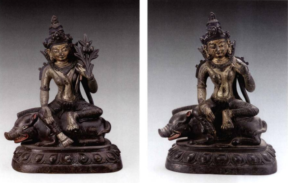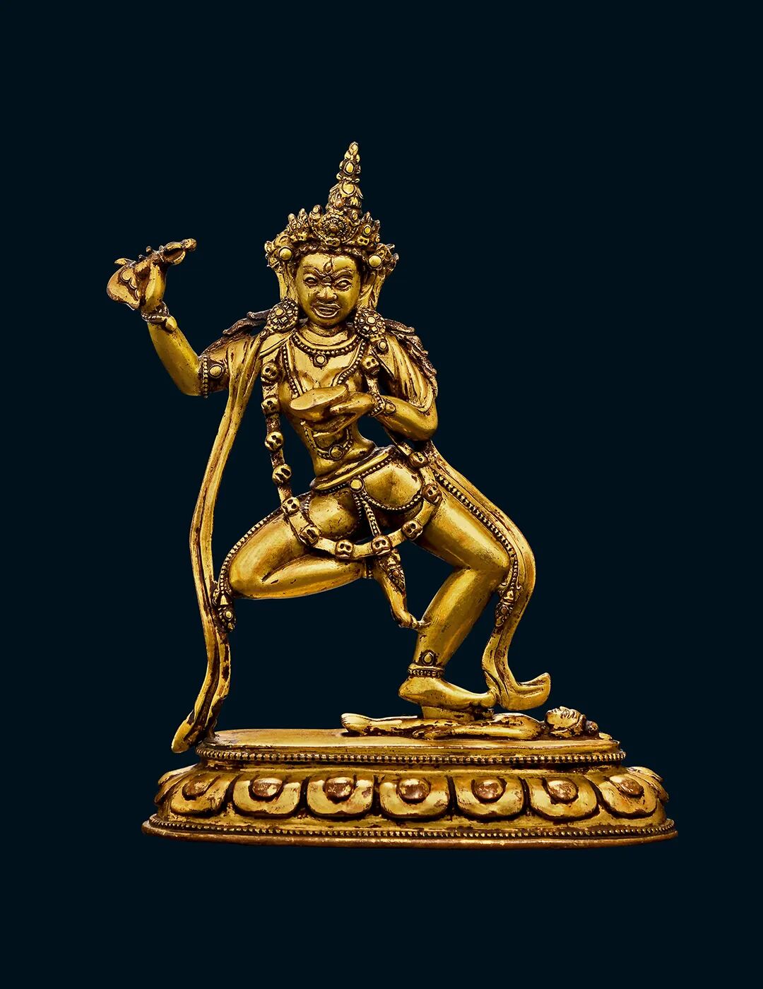 此尊发髻高束,戴五叶骷髅冠,右侧有小猪头形象。三目圆睁,双眉紧簇,面相勇猛威严。饰花朵形大耳铛,长发辫披肩。右手上举持钺刀,左手于胸前托嘎巴拉碗,舞蹈姿踏于人尸之上。身体纤瘦,双乳微隆,颈挂一串骷髅首幔,肩披帔帛,绕过手臂,贴于身侧垂落至莲台,表现出飘逸动感。腰间饰宝带及璎珞,可见腹部肌肉表现。项链、臂钏、手镯、足钏俱足,皆以连珠纹装饰,精密细致。莲座为单层覆莲,上下缘饰细密的连珠,莲瓣扁平宽大,自然舒展,造像鎏金明亮,造型比例合理,身体富有动感,造像工艺娴熟,是一件精美的西藏十六世纪造像,值得关注。藏传佛教中,金刚亥母是摩利支天的化身之一,具有更多空行母的特点;在金刚乘佛教中,是胜乐金刚的明妃。金刚亥母头部右侧有小猪头形象,是其重要的标志。在西藏,金刚亥母密法最受噶举派尊崇,金刚亥母是该派僧人修习的主要本尊之一,亦是玛尔巴、米拉日巴的秘密本尊。修行金刚亥母法可净除烦恼,显俱生智;调柔气脉,证无死果;降伏魔仇,摄十法界,乃了脱生死的殊胜法门。1805