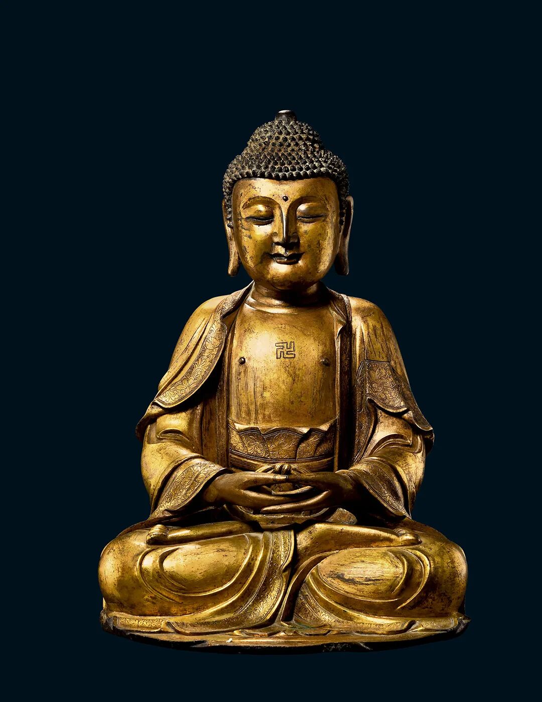 此尊造像头饰螺发,肉髻平缓,发髻中显现顶严。面庞丰阔,额部素洁,眉似弯月,双目低垂,嘴含微笑,予人以接引众生往生极乐的慈悲容貌。上身躯体起伏不大,胸前刻“卍”字符,着通肩袈裟,袈裟褶皱自然,线条流畅。双手于腹前结禅定印,为阿弥陀佛的典型造型。腰间细带,下身着宽松僧裙,双腿结跏趺坐于莲花座上。高大的莲花座工艺精湛,造型古朴,衬托了造像的庄严和圣洁。整像通体镀金,铜质自然,胎体极为厚重,人物饱满、端庄的面容表现和繁复、华丽的衣纹刻画均是明代佛教繁盛的具体表现。不同与明代中后期头大身小的特点,此像合度的比例,也为此其断代为明代中前期提供了依据。如此硕大的体量,精湛的铸造工艺,也从侧面反映出了此像施供者身份地位的重要,或为重要寺院供奉之物,殊为珍贵。阿弥陀佛(梵语Amitābha),又名无量佛、无量光佛、无量寿佛等。大乘经载,阿弥陀佛在过去久远劫时曾立大愿,建立西方净土,广度无边众生,成就无量庄严功德,为大乘佛教所广为崇敬和弘扬。其与观音菩萨、大势至菩萨合称“西方三圣”。在汉传佛教中,阿弥陀佛可谓深受汉地民众崇奉,几乎家家户户都供奉有阿弥陀佛圣像,既展现了阿弥陀佛信仰在汉地的广泛流传,也体现出世人对往生极乐净土的向往。1860