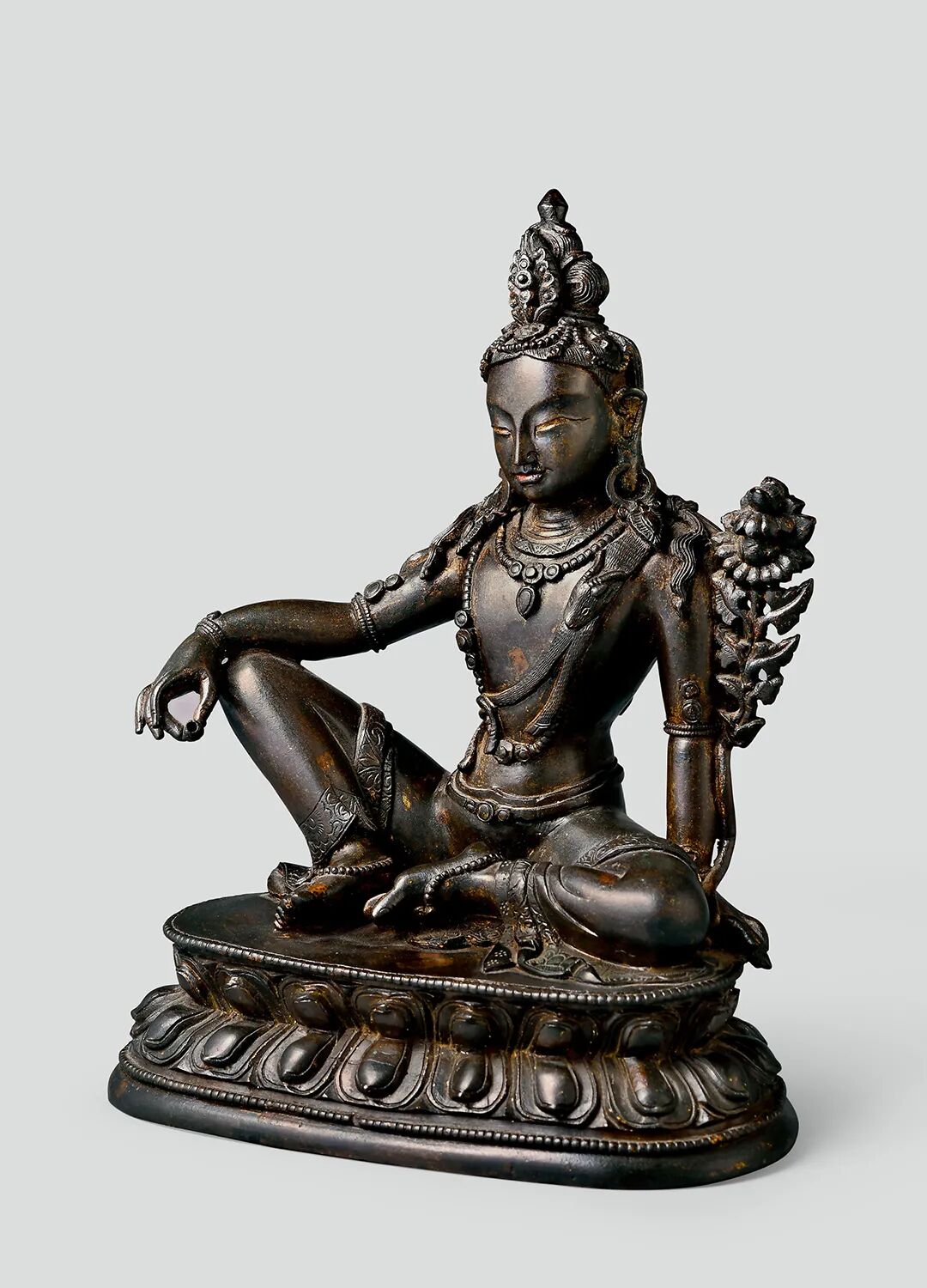 索南坚赞无疑是近段时间被最多热议的15世纪西藏艺术大师,在一尊15世纪铜镀金十一面千手观音造像(图一)的藏文铭文中,此位大师开始被学术界熟知。此尊绿度母呈少女形象,容貌清秀。头戴五叶花冠,身姿挺拔,腰部细收,三折扭姿而坐,曲线柔美。左腿单盘,右腿下伸脚踏莲花之上。无不展现其优美的身体曲线,既有女性的柔美,又暗怀慈悲普度之内在。左手当胸结三宝印,拇指中指轻捻花枝顺双肩两侧向上延伸绽放乌巴拉花,右手置右膝施予愿印,庇佑着芸芸众生。周身佩戴精美的璎珞、钏环,并遵循藏地造像习惯多处镶嵌绿松石。下身着长裙,轻薄贴体,莲珠璎珞随身体曲线散落于腿间,自然协调。裙角铺陈在莲台之上,具有强烈的写实性。束腰仰覆式莲花座,莲瓣饱满,富有力度,整体造型优美、做工极为精致。综上所述与索南坚赞风格极为相似,是16世纪造像中的精品。近几年在拍卖场上屡创新高,非常值得藏家关注。1809
