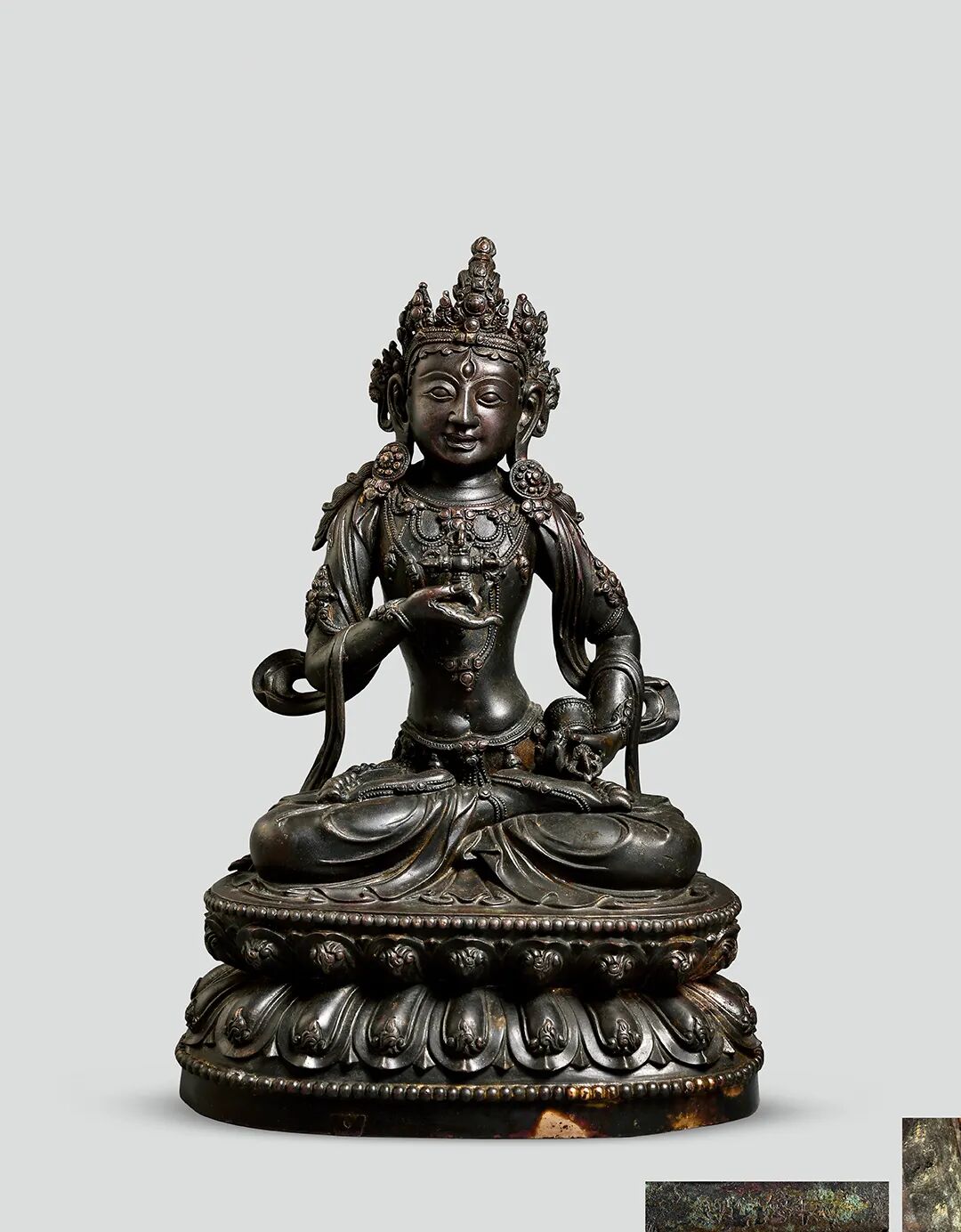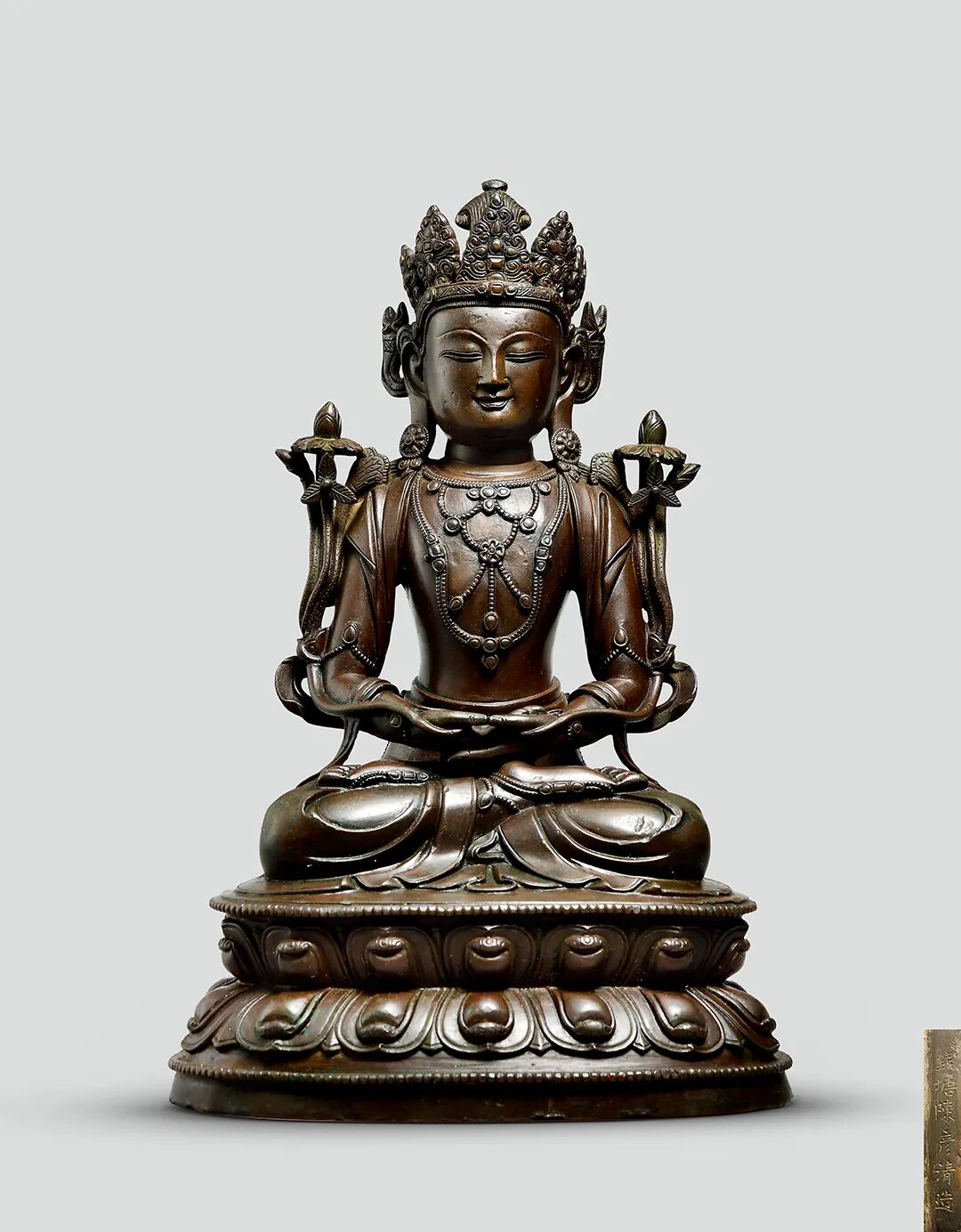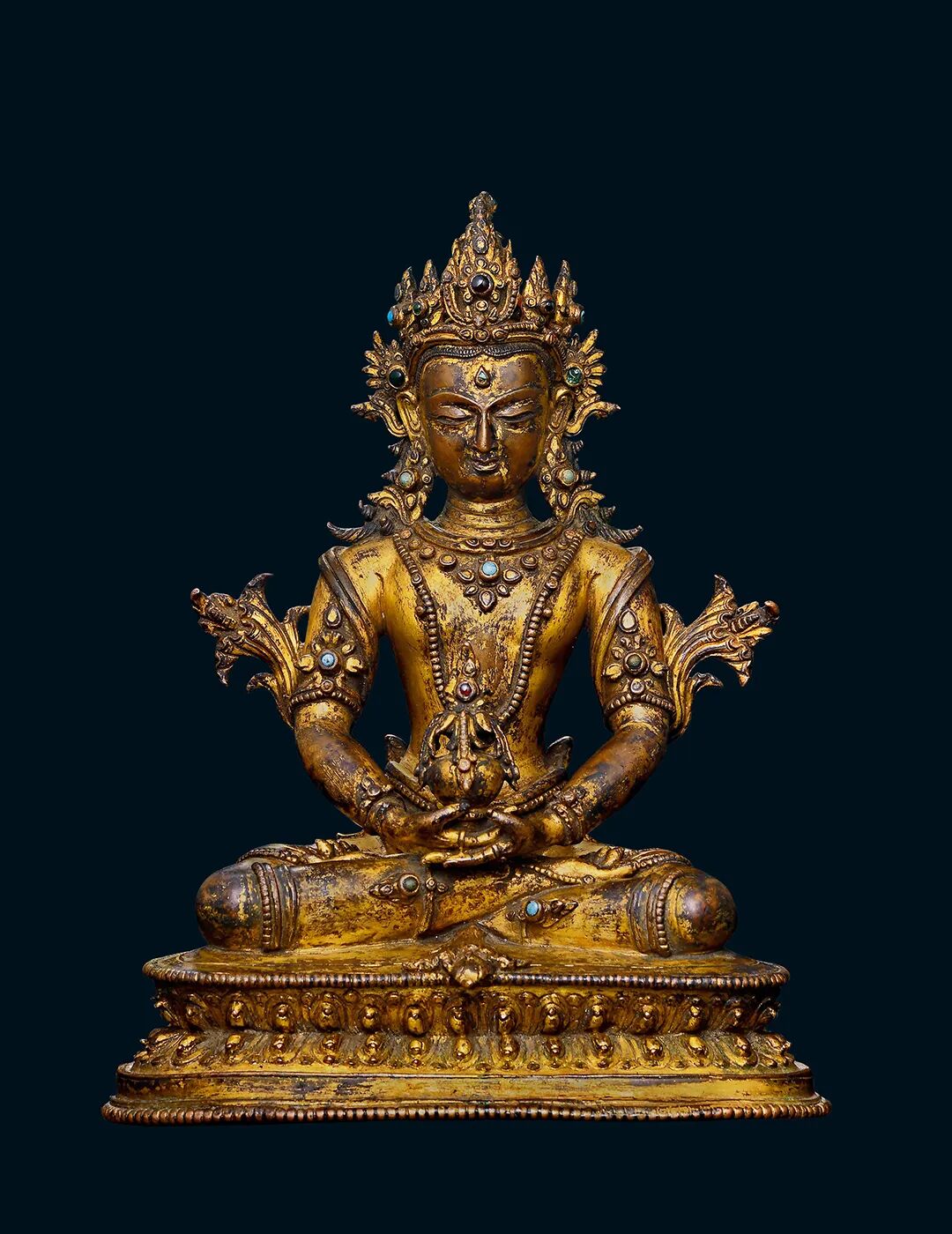 马拉王朝是尼泊尔古代的重要王朝,约1200年是为马拉王朝之始,18世纪廓尔喀兴起,先后灭加德满都、帕坦和巴特冈,重新统一尼泊尔,自此马拉氏族的统治地位遂为廓尔喀王族取代。马拉王朝无疑是在西马拉雅艺术发展史上画上了浓重一笔,其无论是铸造工艺还是艺术体现,都是极为高超。在历年拍卖会上也屡创佳绩。此尊造像发髻为头盔样式,不显发丝,是尼泊尔造像常见的表现形式。戴五叶花冠,花叶高耸,缯带在耳际翻卷,耳下挂耳铛,花叶、冠结、耳铛均镶嵌宝石,十分华丽。面形长圆,前额宽阔,双眉高挑,眉间以绿松石为白毫,双目微阖,鼻梁挺直,双唇上抿,五官刻画精致。颈部饰蚕节纹,上身穿着的天衣样式十分特殊,似披风搭在肩部,绕两臂内侧而下,在肘部飞扬。胸前饰有璎珞,双臂饰有臂钏、手镯。腰间系带,流苏搭于双腿,下身穿轻薄贴体的僧裙,凸显了尼泊尔造像对萨尔纳特风格的继承和发展。双手结禅定印,手捧盛开长寿草的宝瓶,全跏趺端坐在台座上。其下所承双层莲座,束腰明显,莲瓣秀丽小巧、硬朗挺直,对列整齐,封底完整,座后部涂红色颜料的做法,亦为14世纪尼泊尔造像所常见。14世纪是尼泊尔马拉王朝造像艺术最为兴盛的时期,其艺术风格直接影响了元代造像艺术的发展,甚至永宣宫廷造像也有许多当时马拉风格盛行的装饰特征。这尊塑造于14世纪的作品造型大方,体态端庄,躯体雄健,气韵生动,体现了极高的雕刻艺术和铸造工艺水平,是尼泊尔马拉王朝时期不可多得的精品。此尊佛像为无量寿佛,其与阿弥陀佛二位一体,是主持西方极乐世界的教主。密教认为阿弥陀佛之应化身为无量光佛,其报身为无量寿佛。无量寿经卷上言,无量寿佛,威神光明,最尊第一。观无量寿经亦谓,无量寿佛,身量无边,非是凡夫心力所及。常与白度母和尊胜佛母组合,称为“长寿三尊”。修持供奉此像,可延年益寿,增长福德智能,令世间法之事业长寿。1816