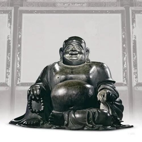 此尊铜弥勒佛体量硕大,系明代存世同类佛造像中少有。所用铜质精良,呈经典的“黑漆古”皮色。弥勒佛身躯浑圆宽阔,圆头大耳,双耳垂肩,开脸十分喜庆,袒胸露腹。左腿盘坐,右腿屈膝坐于垫上,跣足坐于莲座之上。右手持佛珠搭于右膝上,左手持有一只布袋,象征着源源不断的财富。弥勒佛衣饰边缘及袖口处錾刻有精美的缠枝莲纹,内部中空髹朱砂漆,具有典型的明代京造风格。如此大体量的弥勒佛实属罕见,非常值得收藏。弥勒佛通常是供奉在象征着佛教“三解脱门”后的佛殿中,也称弥勒尊佛,即未来佛,于华林园龙华树下成正觉,以三会说法化度无量无边的众生。中国汉传佛教寺院的弥勒佛大多是袒胸露腹、喜笑颜开的形象,是中国民间普遍信奉广为流行的一尊佛。北京2013年秋季拍卖会,明代弥勒佛像高73厘米,RMB4,255,0001867