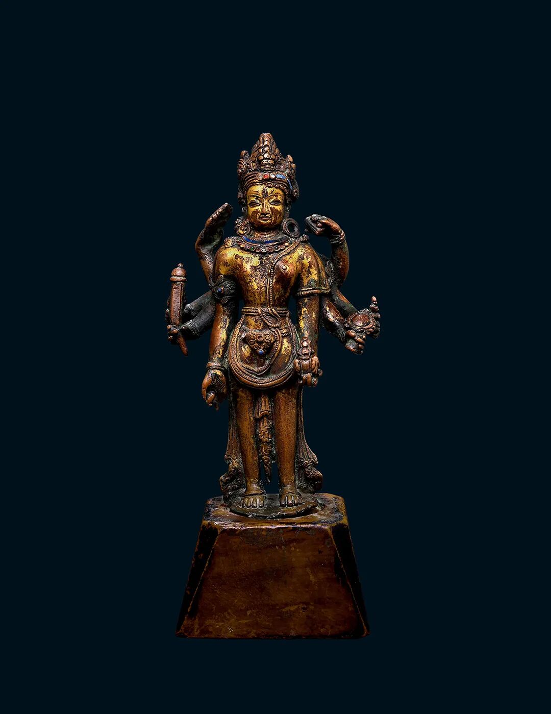 此尊造像以红铜镀金铸造,红铜表面镀金是尼泊尔典型的工艺特征;造像为一面八臂,身体左右两侧各自表现男相和女相;女像一侧表现拉克希米,共有四臂,自上而下依次手持经书、莲花、铜镜,以及宝瓶;男相为毗湿奴,单侧四臂依次持毗湿奴的身份象征物:法轮、法杖、海螺、莲花;拉克希米佩戴椭圆形耳铛,与右侧毗湿奴的卷草形耳铛相对应,这是工匠刻意而为之,便于加以区分;采用同样区分方式的还有女性的胸部、长裙、脚钏、脚链,以及发髻—发髻分为两束,一束为尼泊尔女性传统采用的鼓包型束发,一束为男性特有的高发髻,盘束于头顶,构图十分巧妙,男性与女性特征的塑造在此尊造像上达到了完美的平衡,每一个细微之处都经过精心的设计,别具匠心。整像工艺繁复,细节考究,镶嵌多处,装饰华丽。毗湿奴-拉克希米合体形象这一信仰仅在尼泊尔和克什米尔两地小范围流行,因此存世量极少。由于其极高的神格和双神合二为一的特殊形象,使得毗湿奴-拉克希米像在国际上一直以来受到各大博物馆以及收藏机构的重视。毗湿奴印度三大主神之一,梵天主管“创造”、湿婆主掌“毁灭”,而毗湿奴即是“守护”之神。吉祥天女(Laksmi,音译为拉克希米,又名功德天女、财宝天女),她是毗湿奴的妻子,是印度教幸福与财富女神。在尼泊尔及克什米尔地区,毗湿奴与明妃拉克希米还有一种合二为一的复合形象,这即是本尊造像所表现的题材。这一形象在梵语中被称为Vaikuntha Kamalaja(Vaikuntha为毗湿奴的住所,在这里指代造像右边毗湿奴一侧,kamalaja意为“从莲花中诞生的她”,指代左侧拉克希米),是毗湿奴信仰与拉克希米信仰的组合体,有着至高无上的神格,象征印度教思想中男女单一性或统一性的宇宙本质。在艺术表达中,Vaikuntha Kamalaja可以说是喜马拉雅艺术中最为特殊的形象之一,毗湿奴与明妃以造像身体中轴为界一分为二,分别使用一分为二的男女特征、装饰物、持物等来体现各自的身份。1866
