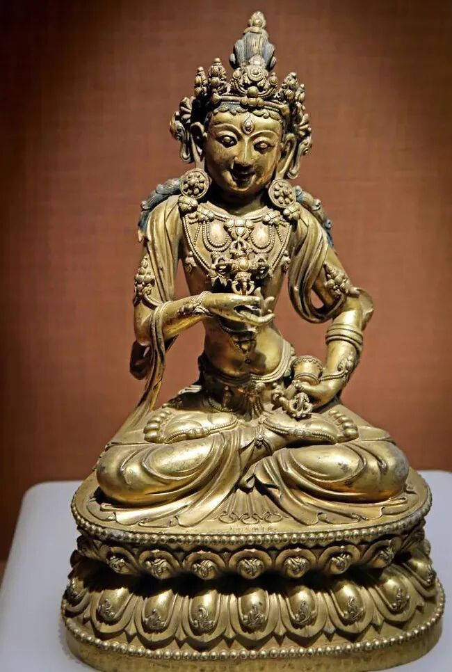 从乾隆二十二年至四十七年间(1758-1783年),清宫先后修建和装修的六品佛楼达8处之多,现在既有文物又有建筑的却仅有故宫紫禁城内的梵华楼和宝相楼,梵华楼的文物和建筑基本完整,宝相楼内所供小佛像分属南京博物院,其余仍在宝相楼内保存。目前能够系统研究的就这两批资料。目前,只有紫禁城里的梵华楼中的绝大部分佛像、唐卡和佛塔,甚至法器保存至今,其它各处或毁于战火;或毁于火灾;或楼虽在,内中一切供器佛像、佛塔已荡然无存;或文物流散在外,难获镜圆,可见此尊之珍罕,是为乾隆宫廷造像的见证。梵华楼为紫禁城内一处重要的藏传佛教神殿,位于紫禁城宁寿宫东北侧,是宁寿宫区建筑群内的一座佛堂建筑,至今基本保持着乾隆时期的原貌,乾隆三十七年始建,四十一年建成,清朝称之为“妙吉祥大宝楼”、“六品佛楼”,是清宫廷佛堂中一种重要模式。六品佛楼供奉的铜像,集合了藏传佛教显密主要神像,展现了其神系庞大,形象丰富的特点。此尊佛母为一面六臂。头戴五叶宝冠,束葫芦形高发髻,缯带在耳后上扬,面相清秀,寂静相。佛母袒露上身,仅身体裸露部分泥金,肩披高扬的帛带,下身着裙,佩饰耳珰,项链、臂钏、手镯、脚镯。主臂左手脐前结禅定印托宝瓶,右手臂放于膝上结与愿印,右上手高擎宝剑。结跏趺坐于覆莲底座上,莲座莲瓣层次清晰,三层连珠纹细腻工整,彰显着标准六品佛楼造像细致、端庄的风格,没有任何疏于刻画的角落。底座下沿阴刻佛名“干催碎佛母”,底座正面中央浮雕“大清乾隆年敬造”七字款,底座背面阴刻“德行根本”款,表明其具体供奉位置,体现了清宫内务府造办处造像的基本特色。1807
