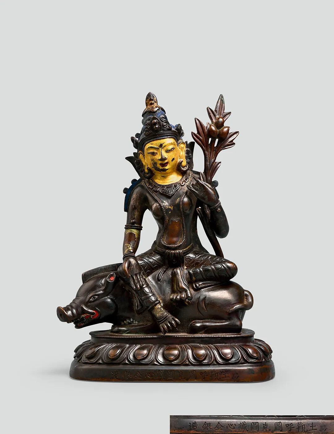 有清一代,帝后贵族皆笃信佛教,他们广施资材,建寺修庙,封赏宗教高层人士,延请高僧大德传法,使佛教尤其是藏传佛教在北京地区得到极大弘扬。而在清朝历代皇帝中,尤以乾隆皇帝所作功德最为巨大。他除了大量建造和修复藏传佛教寺院外,还将满族的宗教信仰从传统萨满信仰更改为信奉藏传佛教,并铸造和绘制了大量藏传佛教造像。这些珍贵的清代皇家圣像以内务府造办处制作的“六品佛楼”造像和为庆皇帝、太后寿辰制作的无量寿佛最被世人熟知,除此之外,还有部分王公贵族和高僧大德制作的佛教造像也属于清代宫廷造像范畴。此次中贸圣佳秋季拍卖“梵尘妙相”专场推出的这尊清乾隆“土观呼图克图诚心金银造”摩利支天像无疑就是这类宫廷造像的典范之作。此尊摩利支天头挽高发髻,发髻编成缠绳状,极富装饰效果。顶置牟尼宝珠,头戴五叶花冠,佩戴圆形大耳环。耳际饰有团花,缯带尾端上扬,动感十足。面庞丰满圆润,额头宽平,眉目清秀,双目微阖,鼻梁高挺,嘴带微笑,展现出善相神灵的慈悲与祥和。上身躯体袒露,四肢健硕,钏镯等饰物一应俱全。身姿婀娜,左手举于胸前,手中轻拈花茎,右手结予愿印。下身着贴身长裙,游戏坐于野猪背上。野猪睁目龇牙,身躯壮硕,卧于莲花座上。莲花座为单层覆莲莲座,莲瓣简洁宽肥,座前下沿楷书“土观呼图克图诚心金银造”题记。整尊造像艺术特点十分突出,展现出鲜明的清代乾隆宫廷造像的艺术特征。整像铜质优秀,胎体厚重,尤其是制作者为了追求造像表面色彩的古拙之感,采用了“黄铜烧古”的作法,同时,造像只在肌体部分施以泥金,而衣着部分以烧古底色示人,这种“黄铜烧古、见肉泥金”是乾隆宫廷造像的重要艺术特点之一。人物造型面庞方阔中正,五官排布规整,眉眼平直,人中较长,这些都是汉地艺术的审美偏好,符合内地宫廷一贯的造像样式,在清宫制作的藏传造像上均能发现。造像躯体健硕,四肢粗壮,身体姿态略显板滞,莲瓣简约规整,也都是清代乾隆宫廷制作佛像常用的表现手法。款识的刻写位置、文字字体、文字顺序等特征,也与“六品佛楼”造像有着异曲同工之妙。可参阅在首都博物馆、国家博物馆中收藏的“土观呼图克图诚心金银造”清代摩利支天造像,经过比对,此尊无论在材质、在工艺、在人物造型,还是刻写款识上几乎完全一致,可见,此尊摩利支天像应为清代乾隆时期宫廷造像无疑。此尊造像刻款中提及的土观呼图克图,也是清代藏传佛教历史上有着重要宗教地位的活佛转世体系,颇为值得我们关注。据史料记载,土观呼图克图共传六世,前述已确定此尊造像具有清代乾隆时期宫廷造像的艺术风韵,而与此时代对应的应为三世土观呼图克图。三世土观呼图克图洛桑却吉尼玛出生于乾隆二年(1737),6岁时被认定为转世灵童,迎请至佑宁寺坐床。据传,大师“自幼敏慧而善学”,学习成绩极为优异,先后师从七世达赖喇嘛、六世班禅、三世章嘉呼图克图、二世嘉木样等大德修习佛法,学成后返回佑宁寺,担任佑宁寺第三十六任法台。乾隆二十八年(1763)奉旨入京,颇受乾隆皇帝赏识,担任掌印喇嘛、御前常侍禅师等宗教职务。大师一生弘扬佛法,亲自撰写和翻译了许多佛教著作,其中,《章嘉国师若必多吉传》、《宗派源流水晶镜》等著作流传至今,具有极高的学术研究价值。另外,三世土观呼图克图还是一位佛教艺术大师,他曾配合三世章嘉呼图克图鉴定清宫内的造像和绘画,还曾担任乾隆时期宫廷造像的宗教顾问和艺术指导,确保造像和绘画能够遵守佛教度量和宗教仪轨。综上所述,此尊造像胎体厚重,铜质莹润,造型规整,工艺精细,其造型特点和艺术气韵与清乾隆“六品佛楼”造像十分类同,令今人感受到乾隆宫廷造像的雅致与华美。造像施主为三世土观呼图克图,其深厚的佛教修养和高超的艺术水准,也让此尊造像的艺术成就相对于同时期其他造像要高出一筹,实为礼敬崇奉和收藏投资的绝佳之选。1808