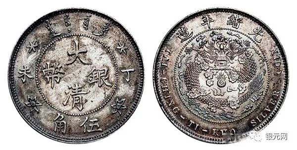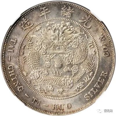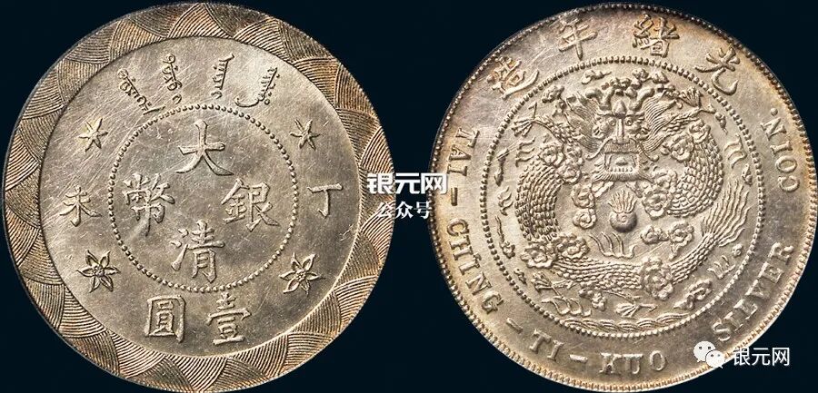 第二,丙午和丁未“大清银币”,背面有英文“大清帝国银币”:“TAI—CNING—TI—KUO SILVER COIN.”,其他清末银币,“银元网”公众号。除天津度支部造币总厂于光绪三十四年 1908年 所铸造的“光绪元宝”也有这一英文外,其他未见有。