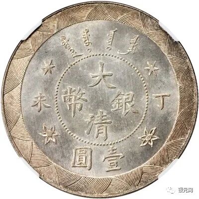 第四,丙午和丁未“大清银币”,正面的图案为边缘水波纹,中间为满文“大清银币·丙午·壹两”或“大清银币·丁未·壹圆”,中间“大清银币”,分外、中、内三个层次,而其他清末银币,正面图案只分边缘“××省造·库平七钱二分”和中间“大清银币”或“光绪元宝”两个层次。