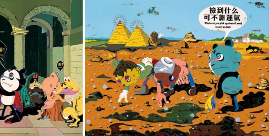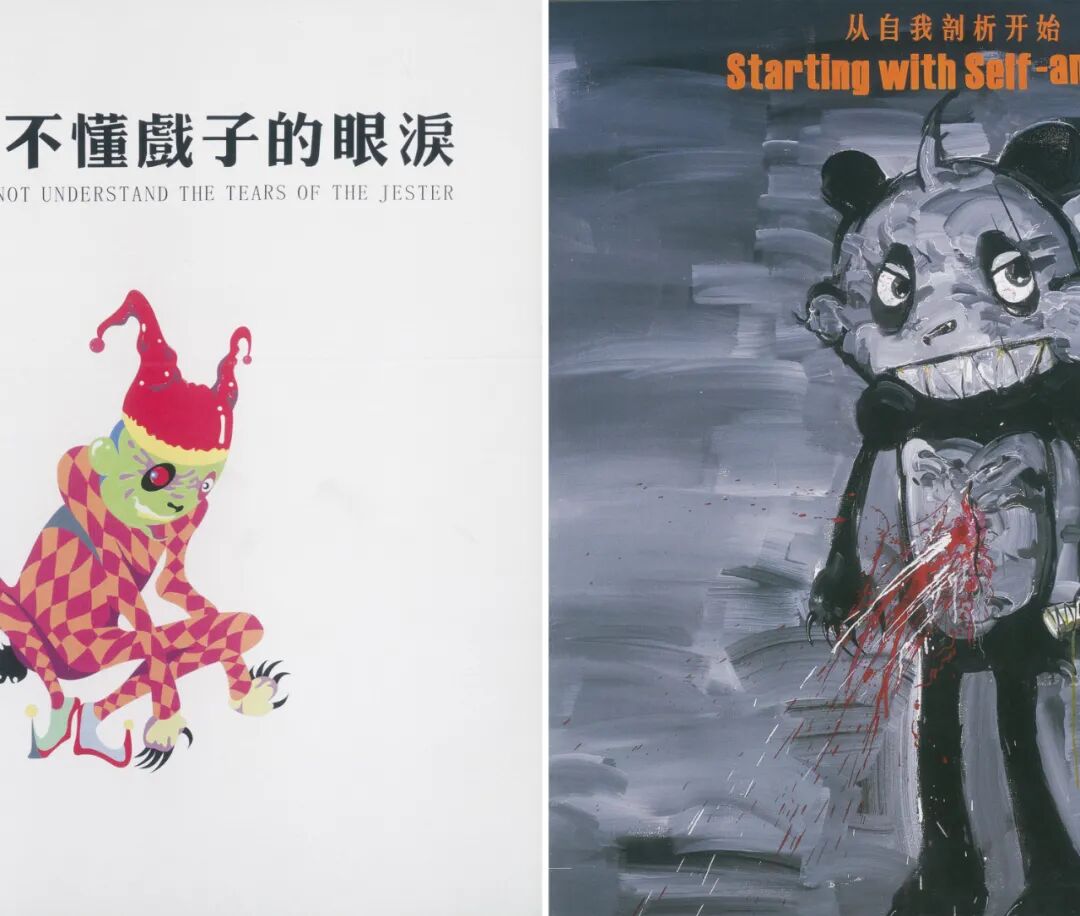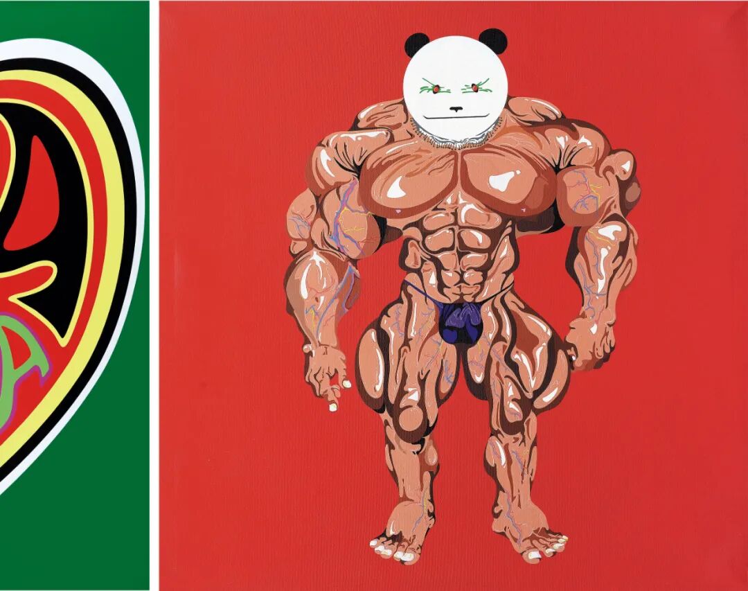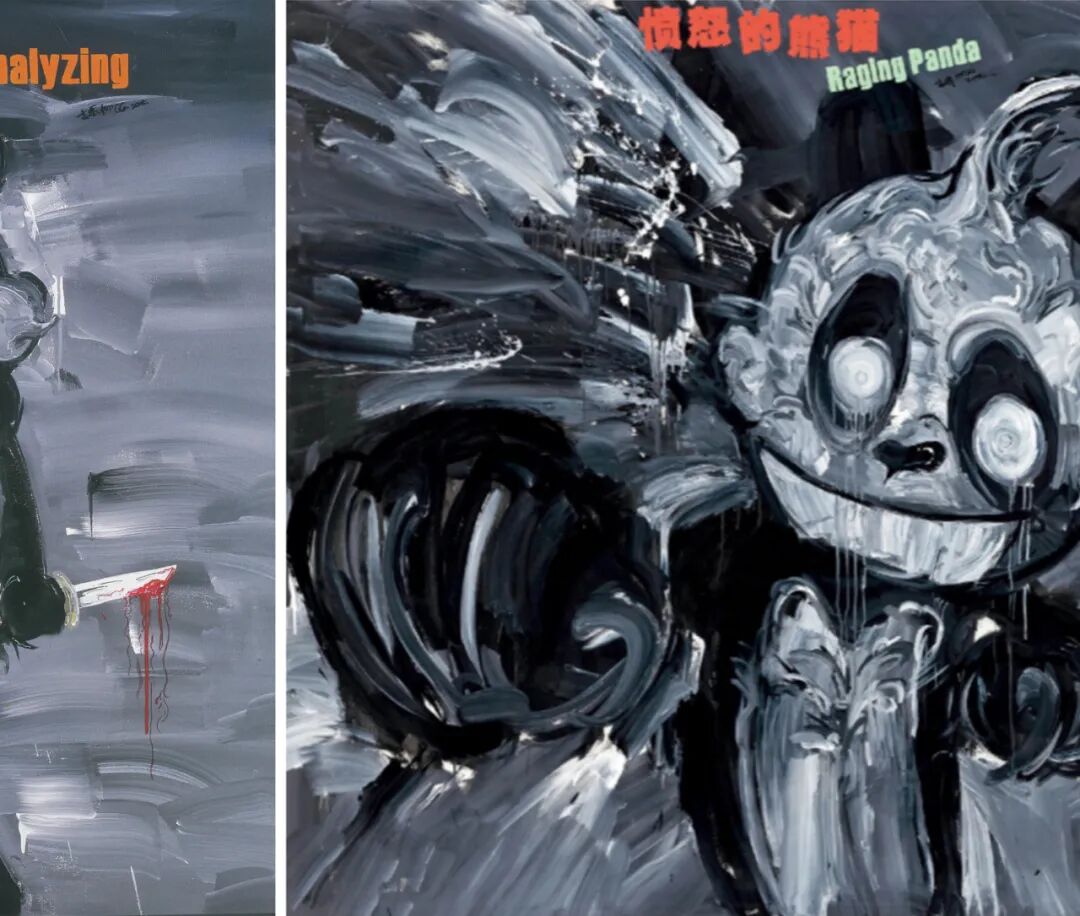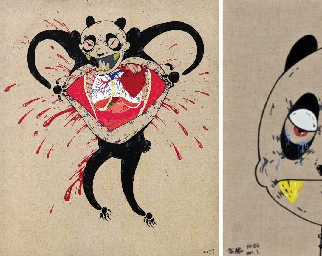 在高瑀的早期作品中,熊猫形象是其创作的主要标志。在他的笔下,他将熊猫温顺,可爱,憨厚的经典形象进行反转,赋予其暴躁,疯狂,激情的性格元素,用缺乏合理动机的极端行为,精神分裂式的幻觉来诠释生活本身的残酷性。这些丰富的形象放在一起就可以看出高瑀对中国当代艺术更深层次的理解。他真实描述了“当代艺术斗争”——“善”与“伪”、“美”与“丑”被混淆在一起。