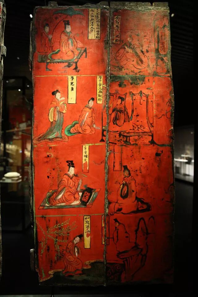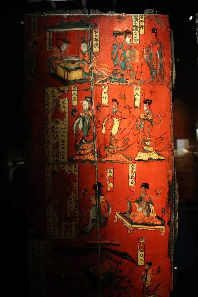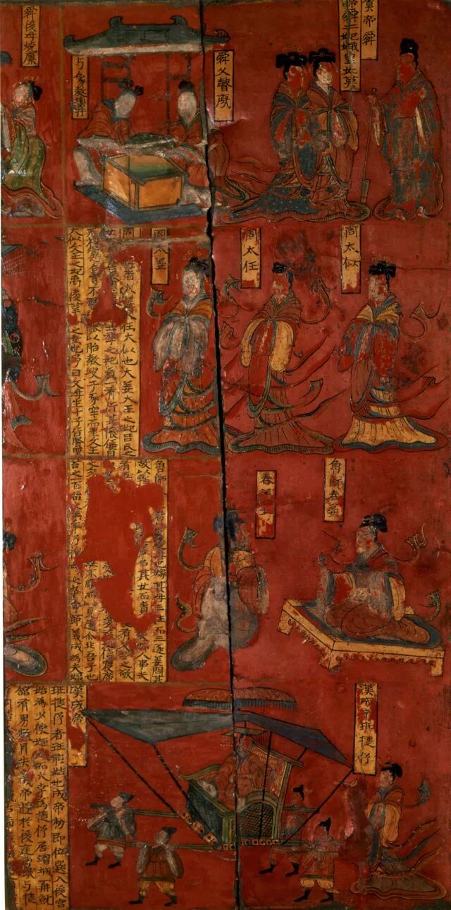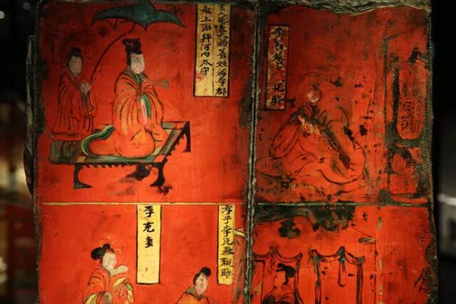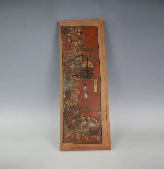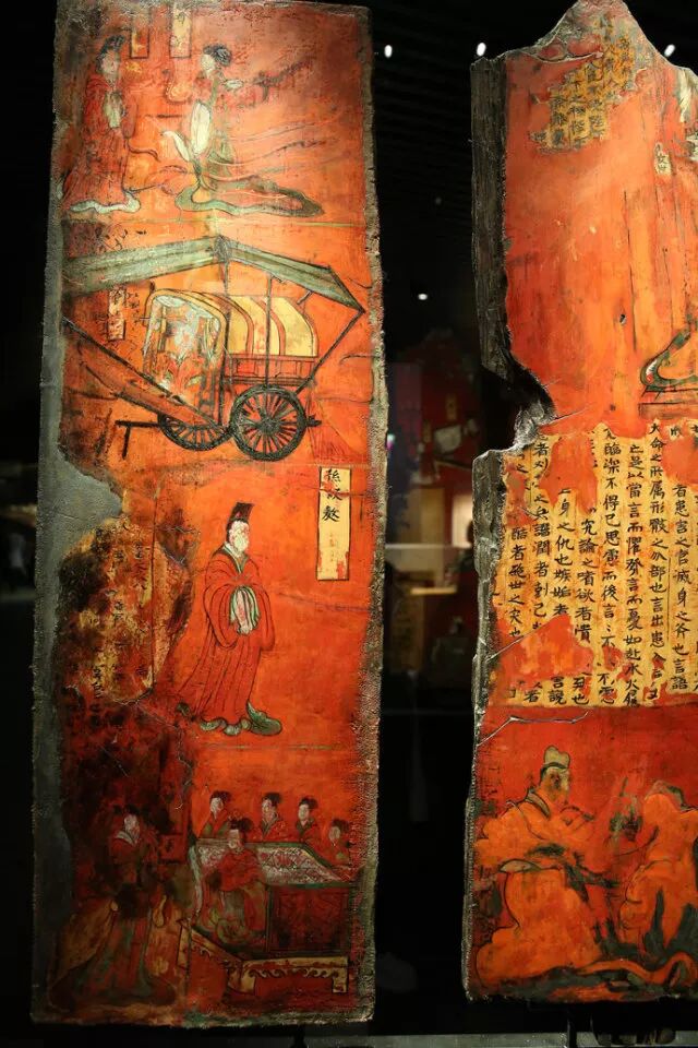 其中有两块可以拼接。拼接后的板面宽约40厘米,遍涂朱红漆,分四层绘制帝王、忠臣、孝子、列女、高士、名贤等人物故事,每层高约20厘米,每幅都有文字题记和榜题,说明故事内容和人物身份。