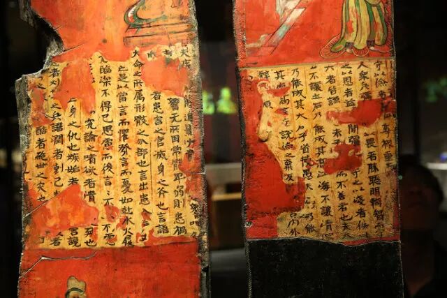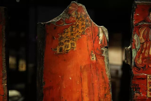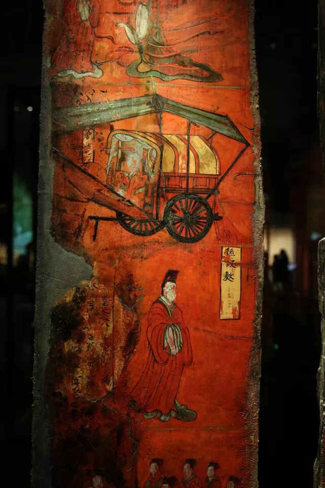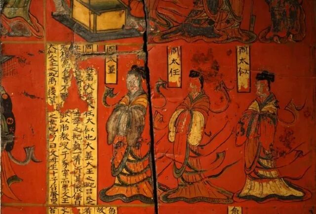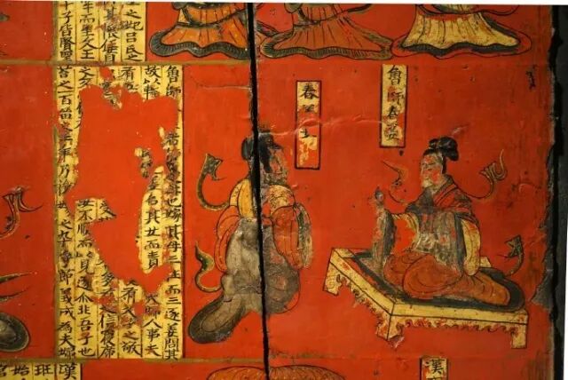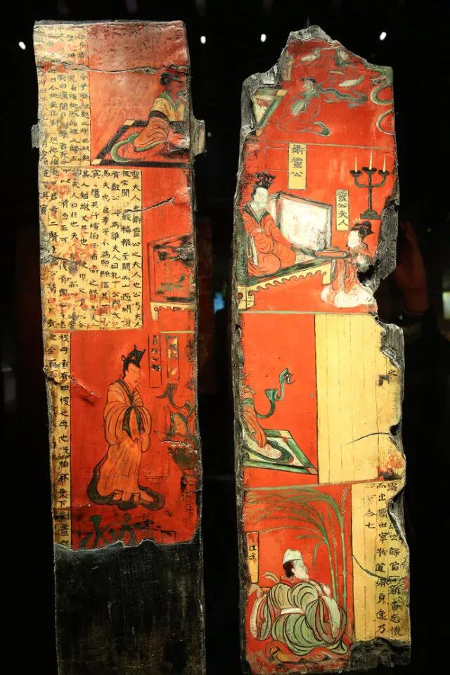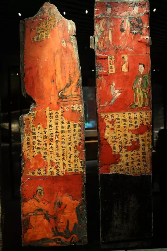 其中有两块可以拼接。拼接后的板面宽约40厘米,遍涂朱红漆,分四层绘制帝王、忠臣、孝子、列女、高士、名贤等人物故事,每层高约20厘米,每幅都有文字题记和榜题,说明故事内容和人物身份。